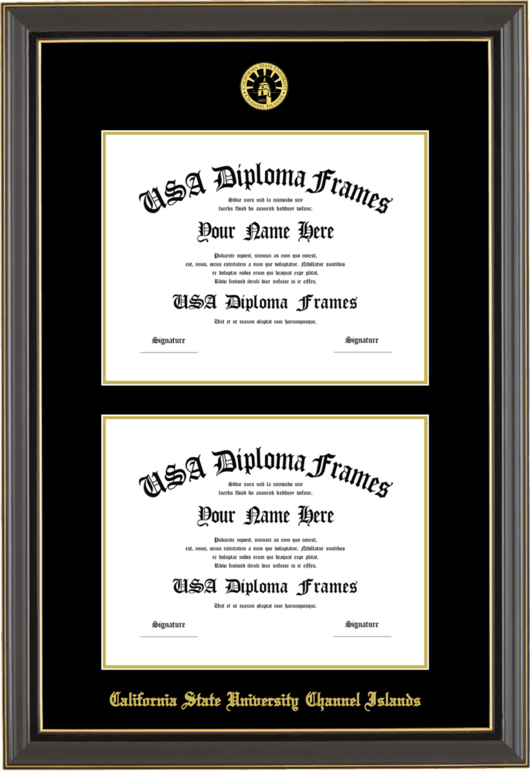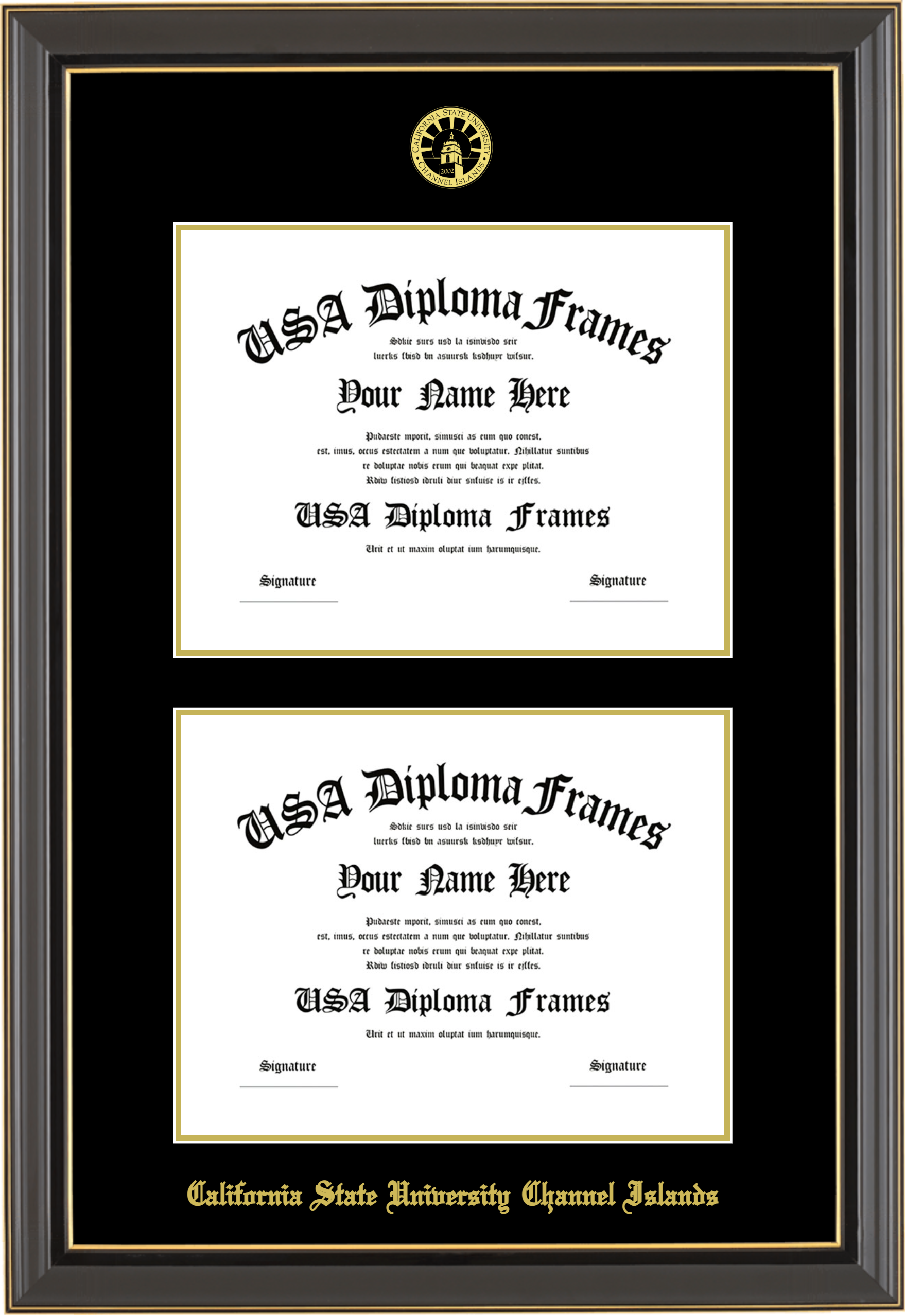 California State University Channel Islands Double Diploma Frame – Double Document – Black Gold Trim Glossy – Black and Gold Mat