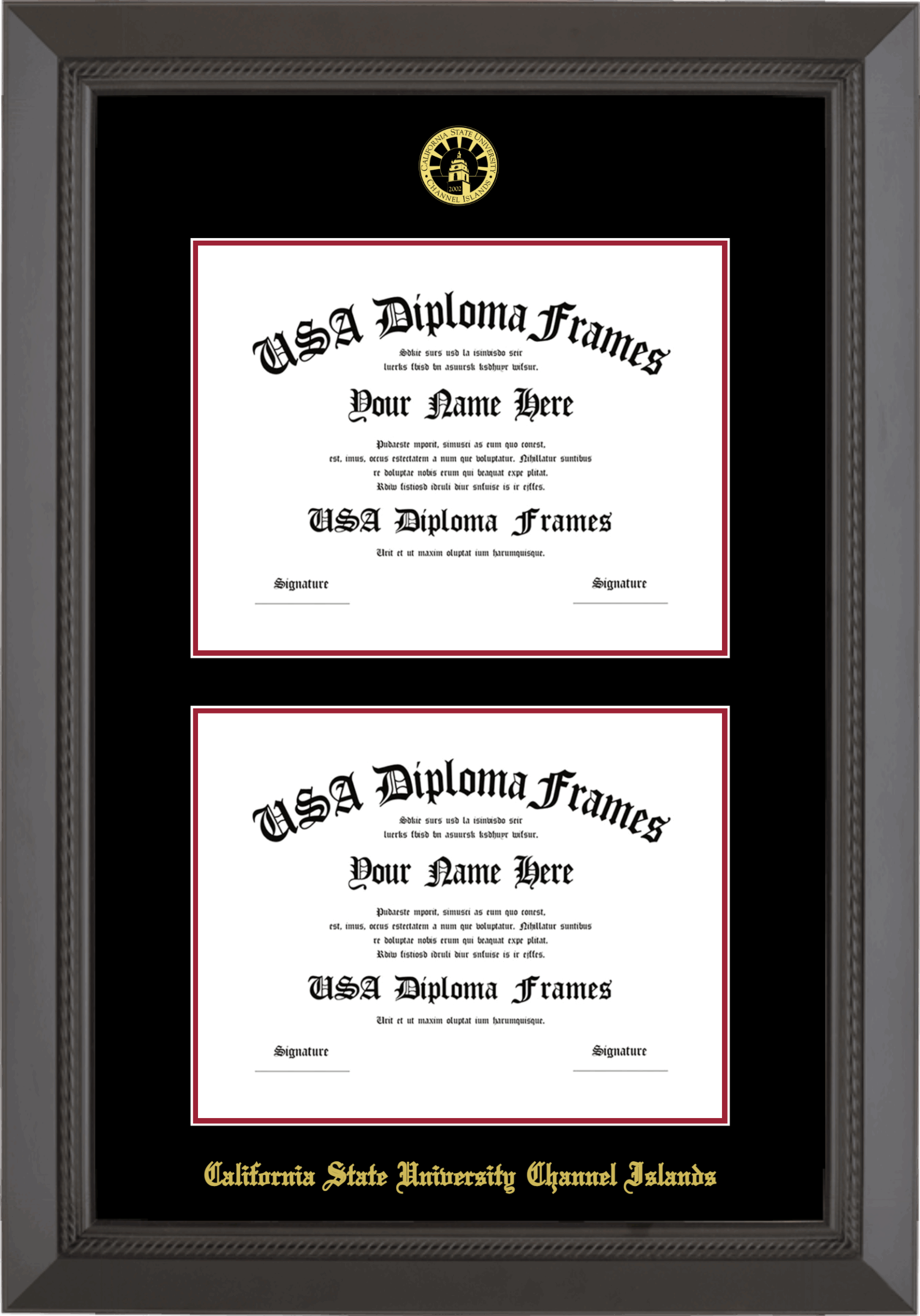 California State University Channel Islands Double Diploma Frame – Double Document – Black Rope – Black and Crimson Mat