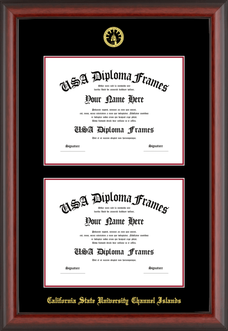 California State University Channel Islands Double Diploma Frame – Double Document – Cherry Mahogany Matte – Black and Crimson Mat