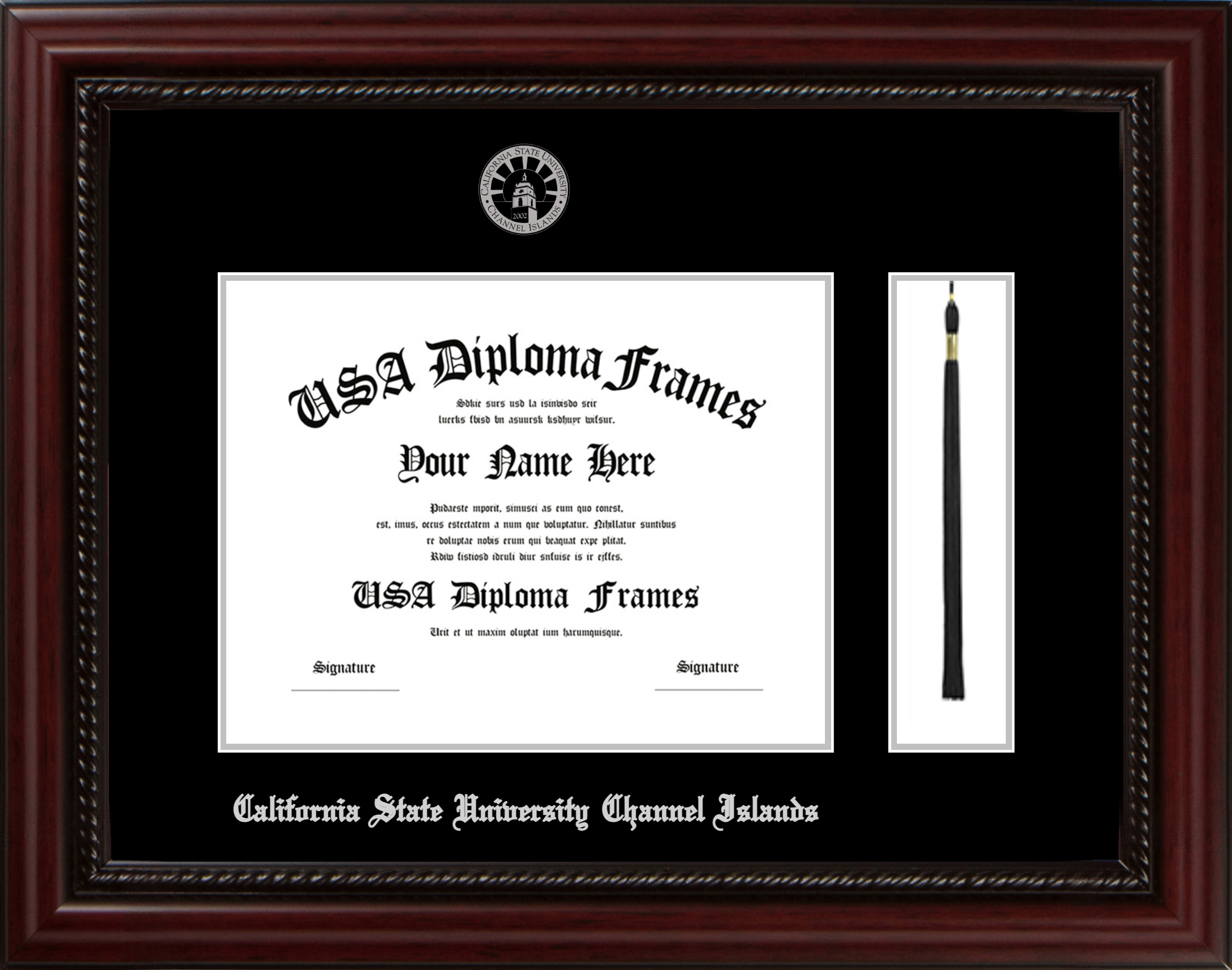California State University Channel Islands Diploma Frame with Tassel – Executive Cherry Rope – Black and Silver Mat