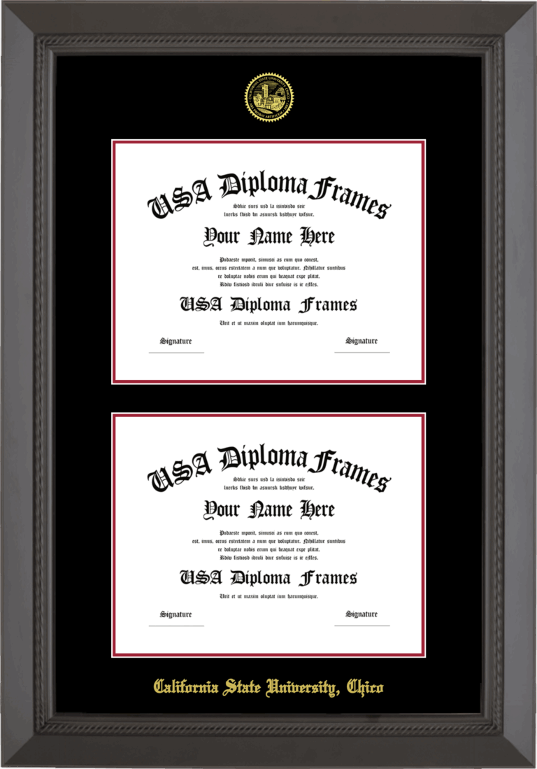 California State University, Chico Double Diploma Frame – Double Document – Black Rope – Black and Crimson Mat