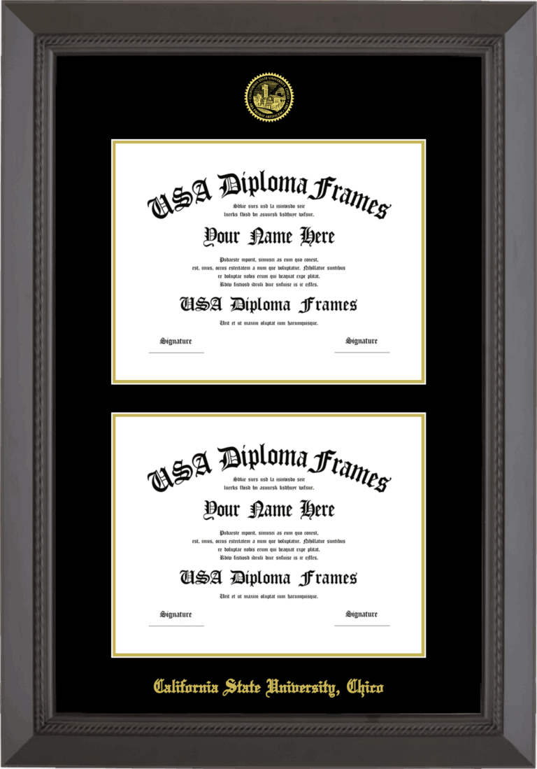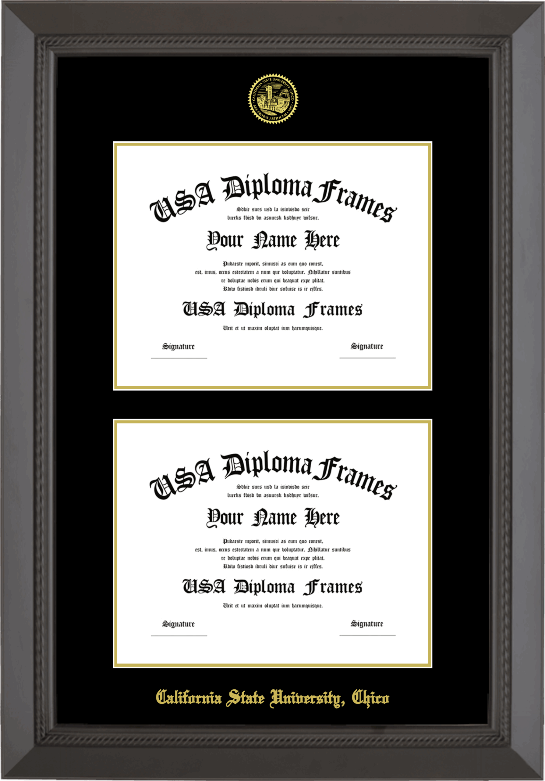 California State University, Chico Double Diploma Frame – Double Document – Black Rope – Black and Gold Mat