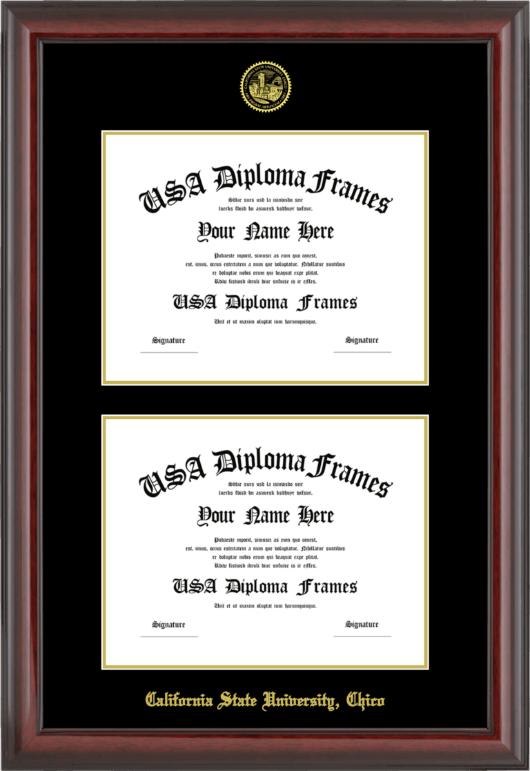 California State University, Chico Double Diploma Frame – Double Document – Cherry Mahogany Glossy – Black and Gold Mat