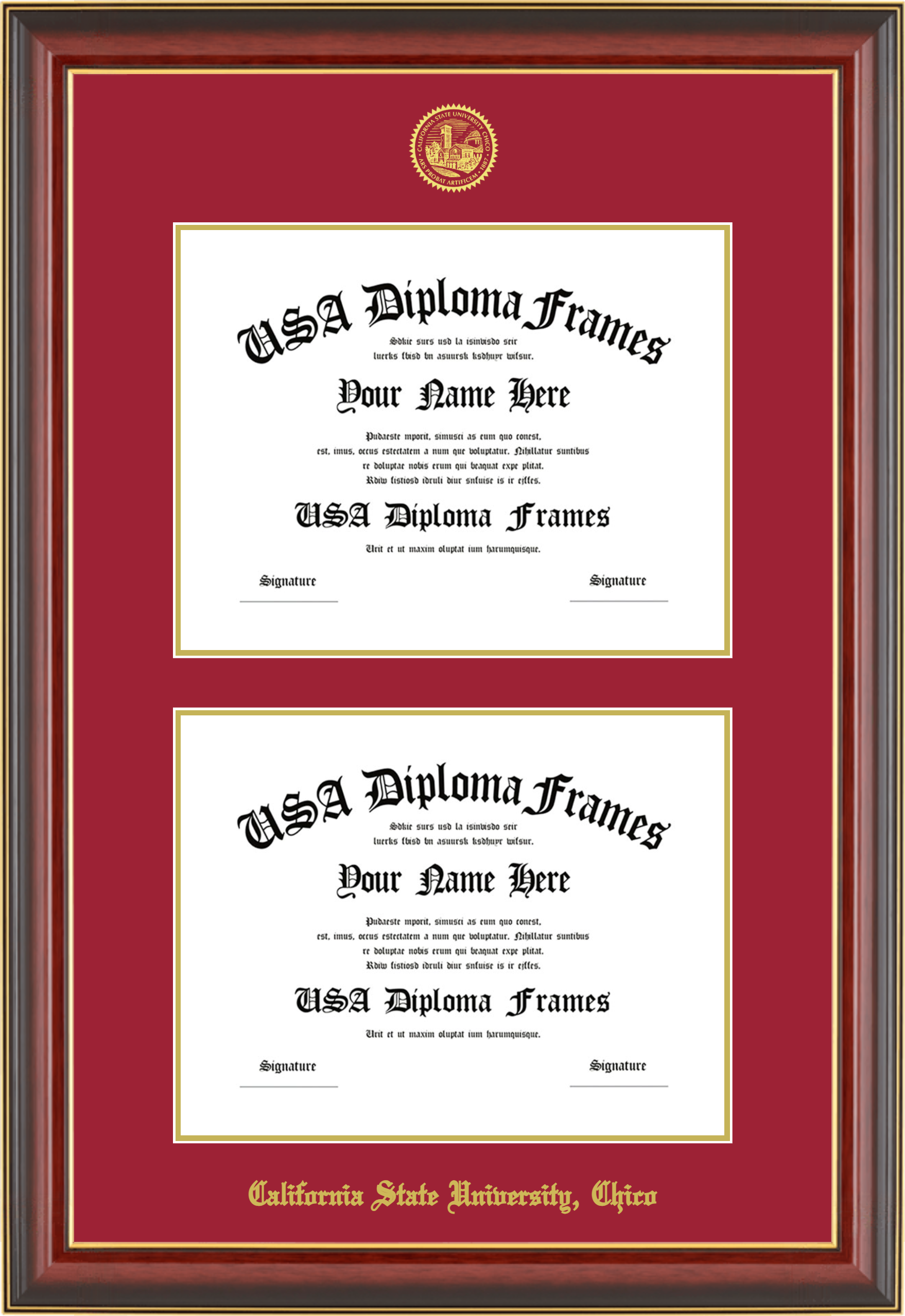 California State University, Chico Double Diploma Frame – Double Document – Cherry Mahogany Gold Trim Glossy – Crimson and Gold Mat