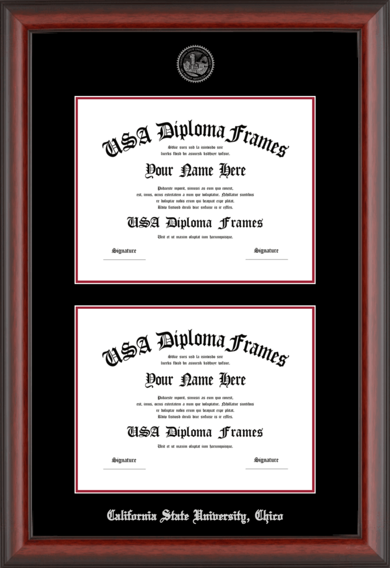 California State University, Chico Double Diploma Frame – Double Document – Cherry Mahogany Matte – Black and Crimson Mat