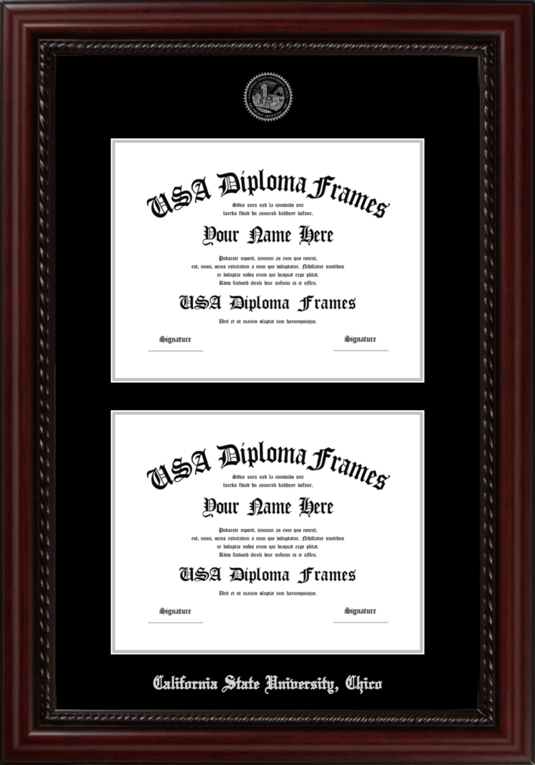 California State University, Chico Double Diploma Frame – Double Document – Executive Cherry Rope – Black and Silver Mat