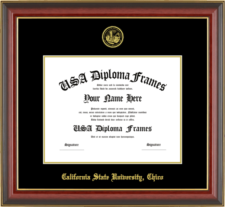 California State University, Chico Diploma Frame – Cherry Mahogany Gold Trim Glossy – Black and Gold Mat