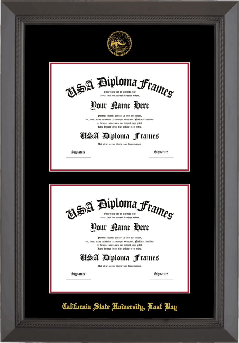 California State University, East Bay Double Diploma Frame – Double Document – Black Rope – Black and Crimson Mat