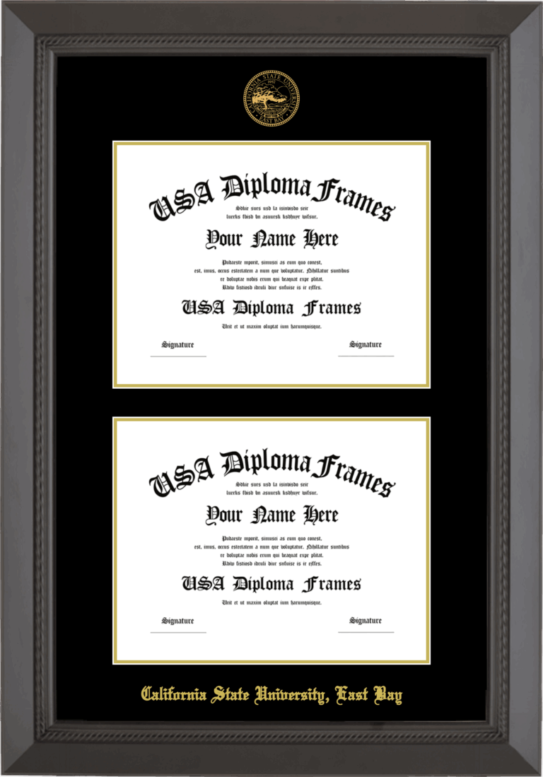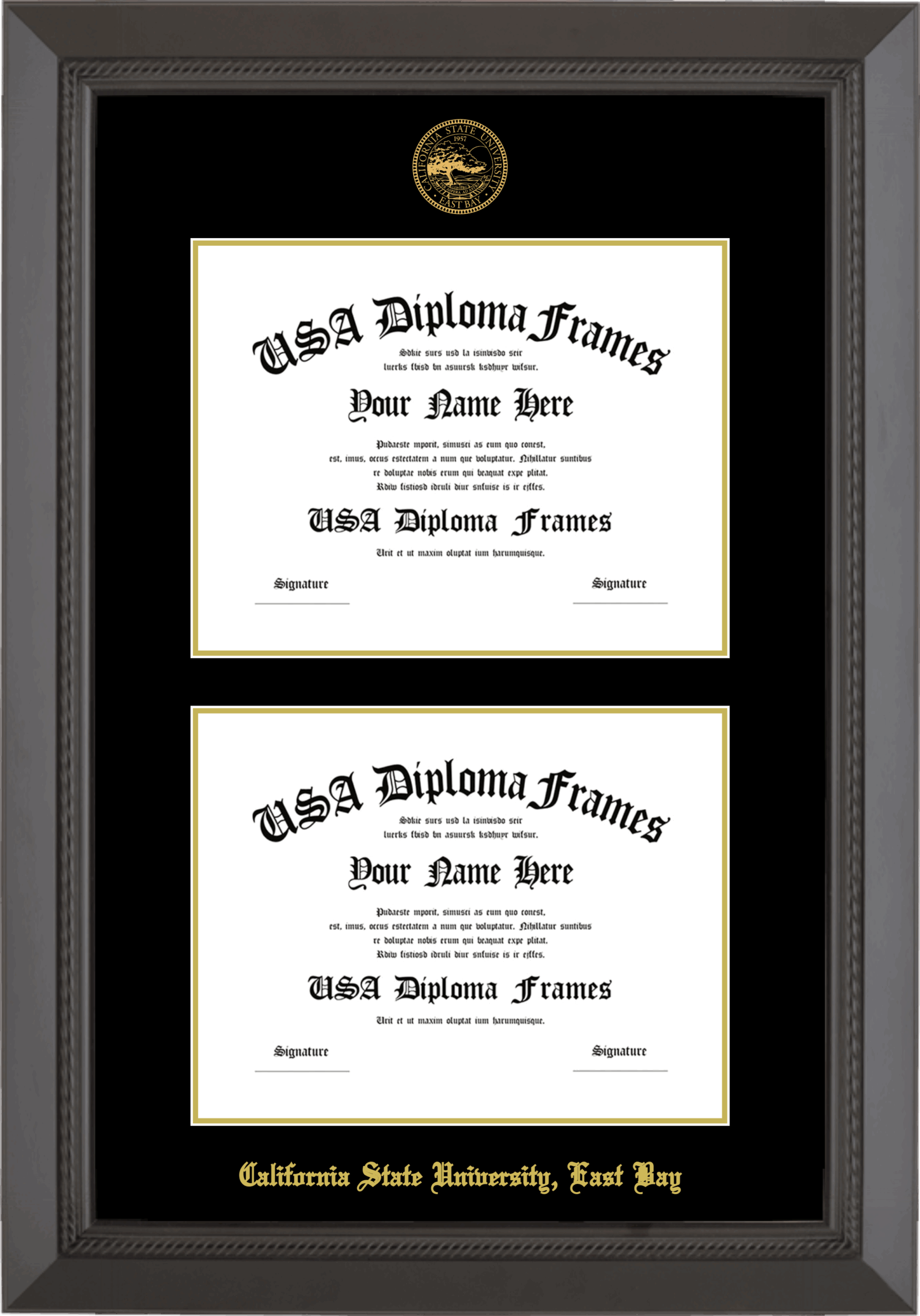 California State University, East Bay Double Diploma Frame – Double Document – Black Rope – Black and Gold Mat