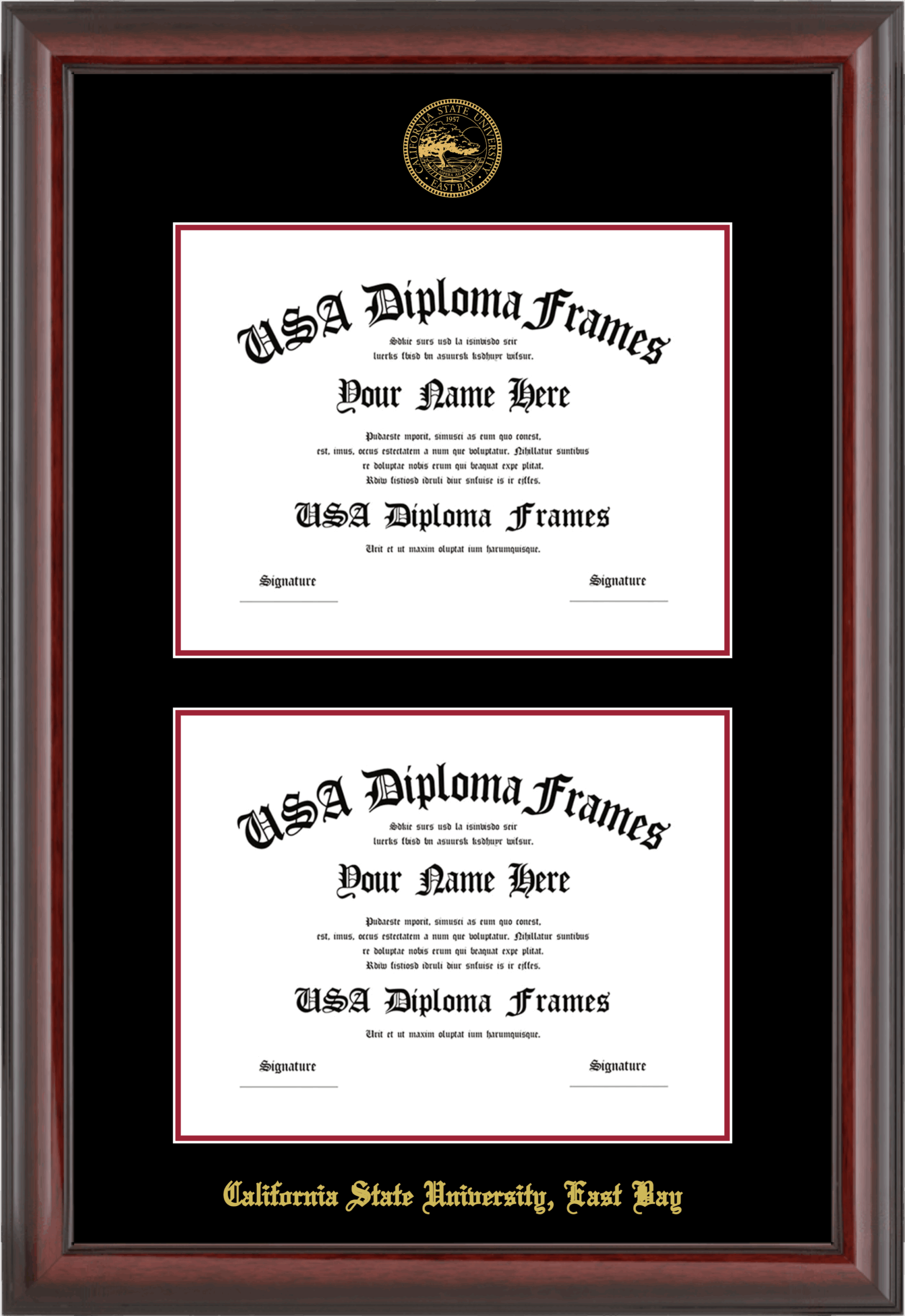 California State University, East Bay Double Diploma Frame – Double Document – Cherry Mahogany Glossy – Black and Crimson Mat