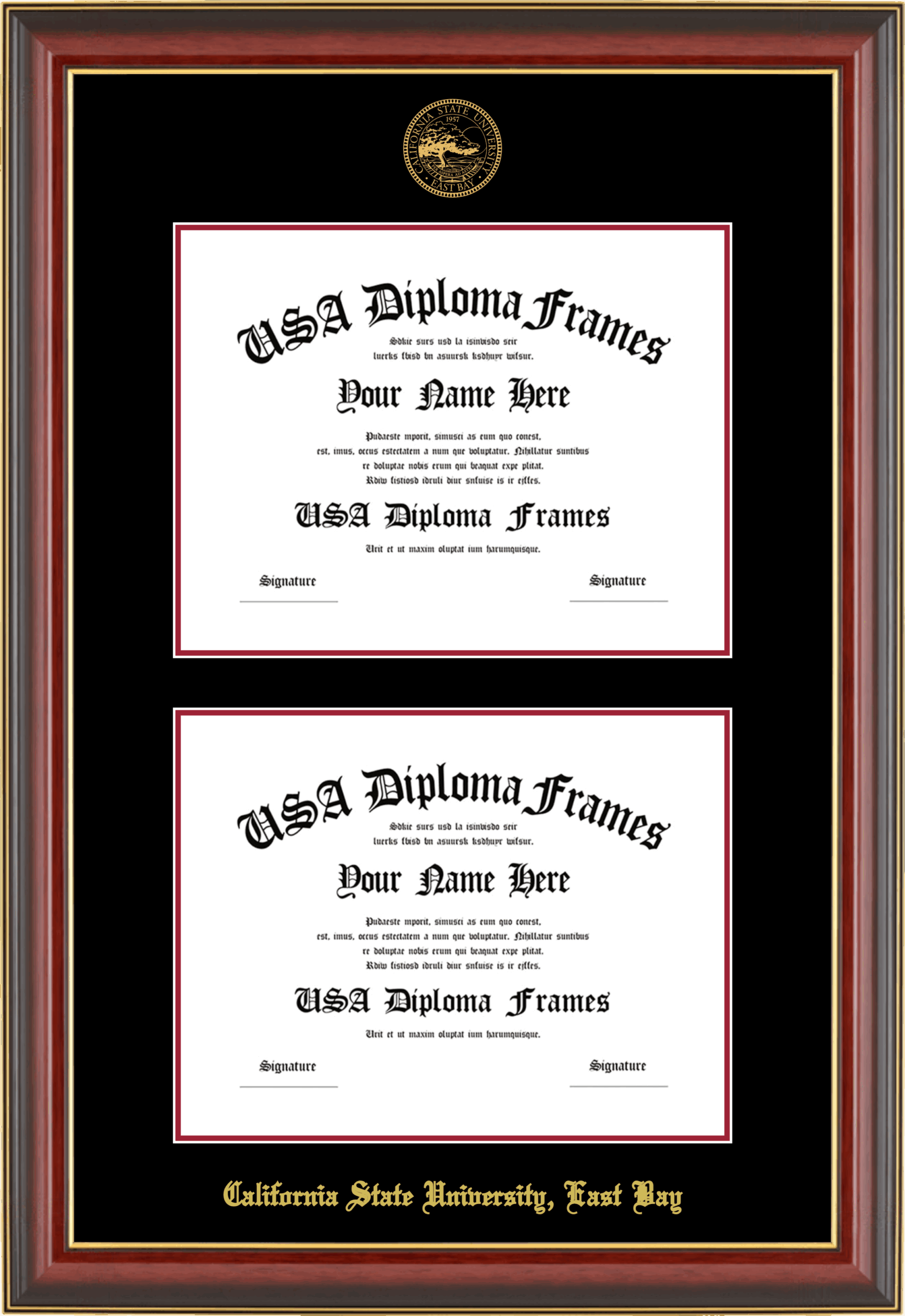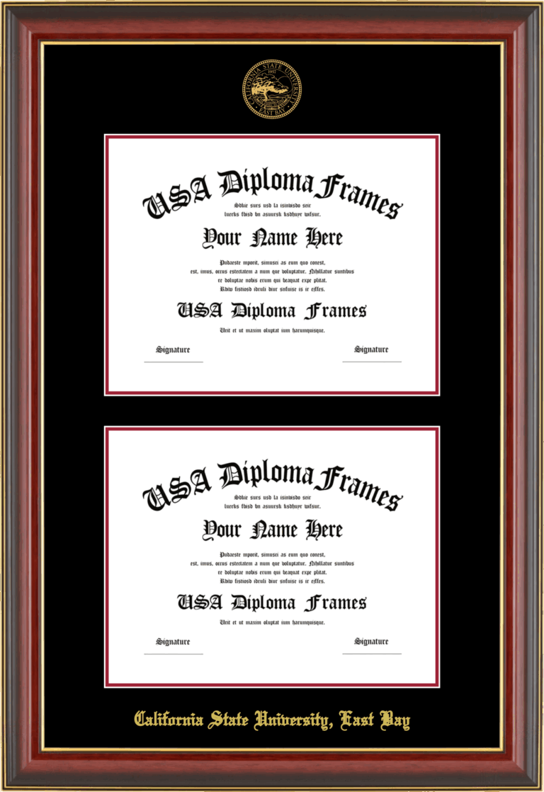 California State University, East Bay Double Diploma Frame – Double Document – Cherry Mahogany Gold Trim Glossy – Black and Crimson Mat