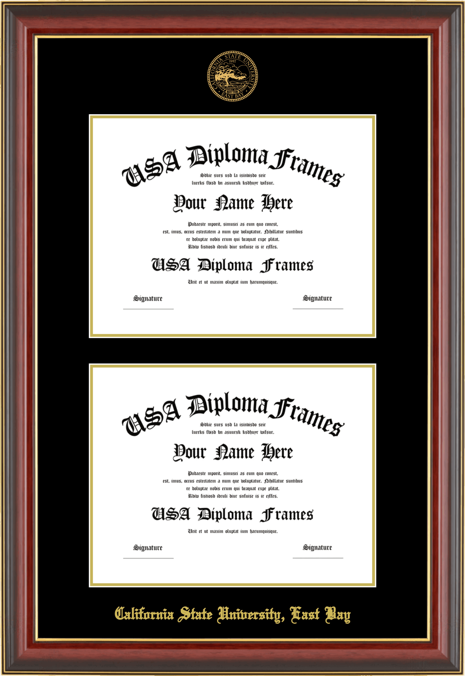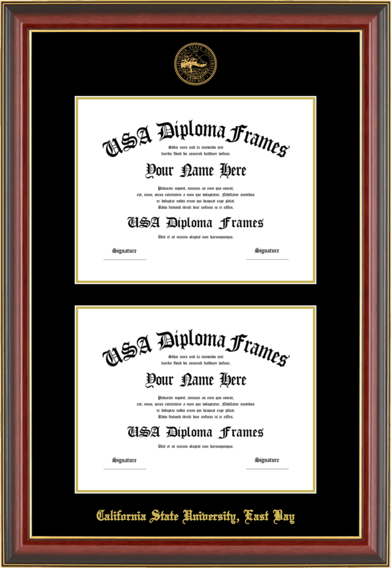 California State University, East Bay Double Diploma Frame – Double Document – Cherry Mahogany Gold Trim Glossy – Black and Gold Mat