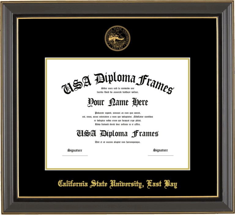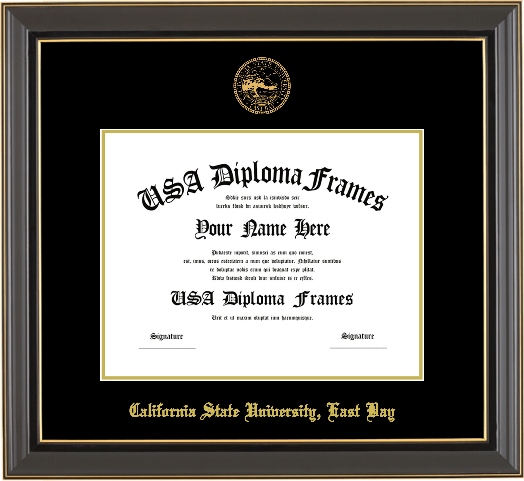 California State University, East Bay Diploma Frame – Black Gold Trim Glossy – Black and Gold Mat