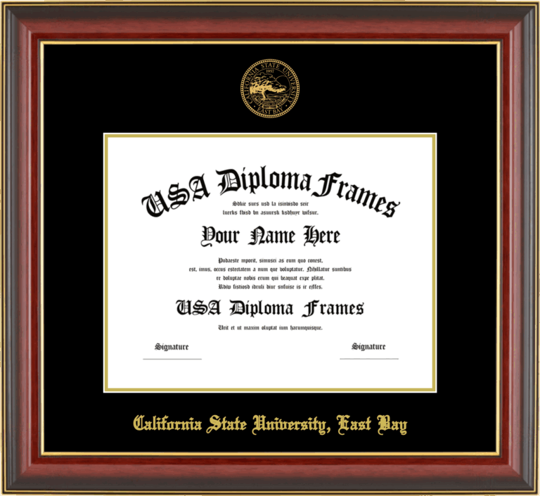 California State University, East Bay Diploma Frame – Cherry Mahogany Gold Trim Glossy – Black and Gold Mat