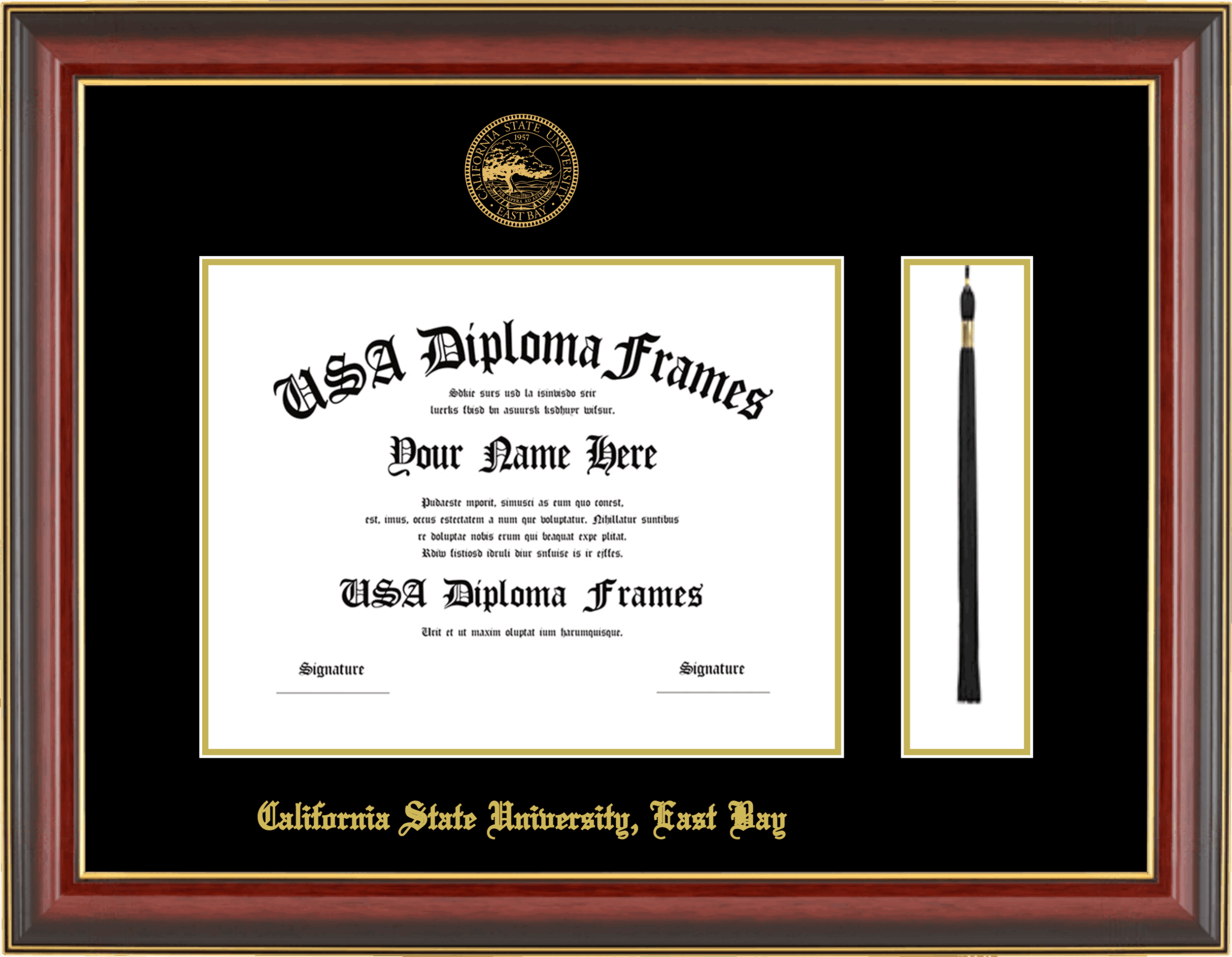 California State University, East Bay Diploma Frame with Tassel – Cherry Mahogany Gold Trim Glossy – Black and Gold Mat