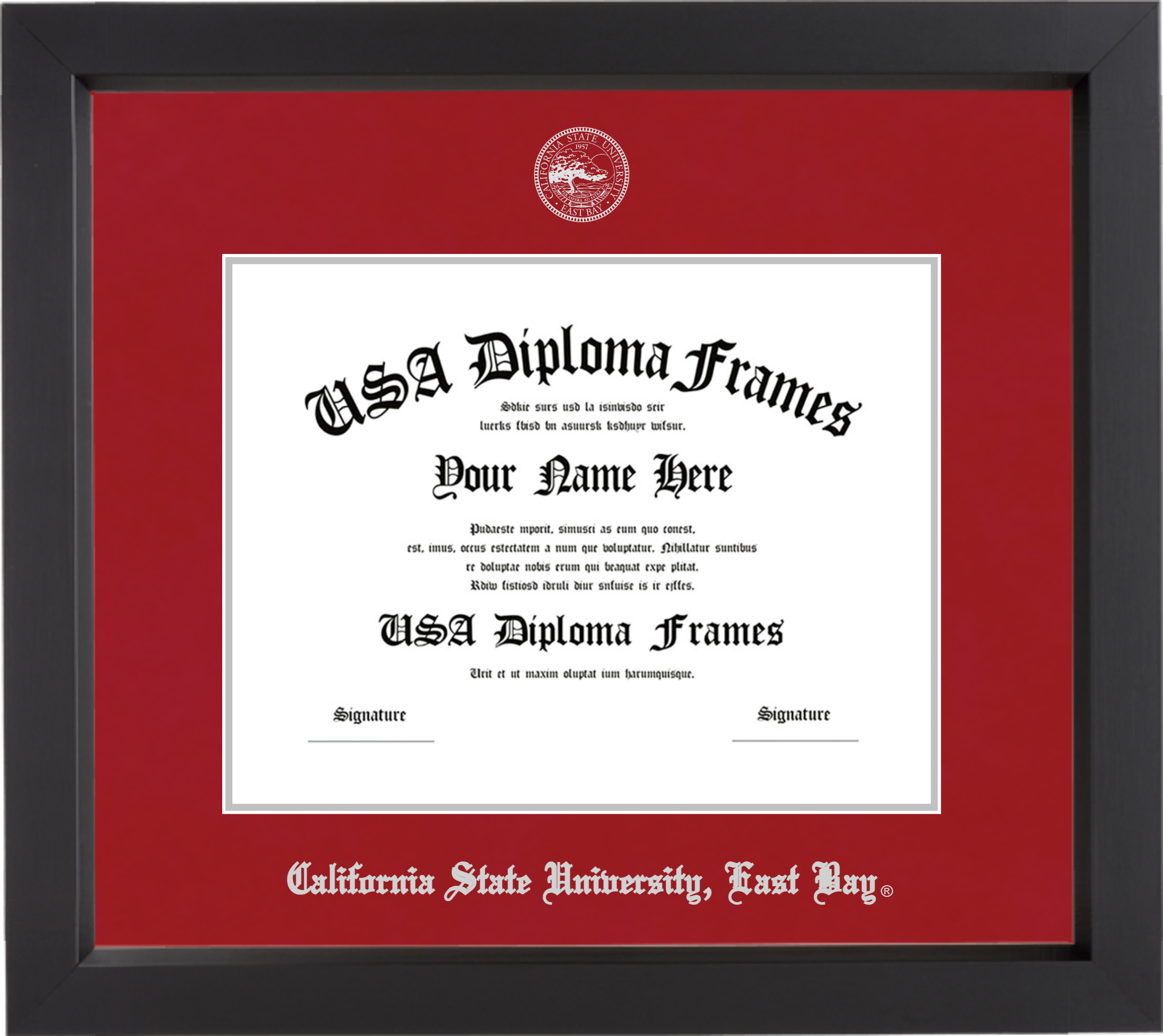 California State University, East Bay – Single Horizontal Document ( Diploma ) – Black Matte – Crimson Mat – Silver Accent Mat – With Seal(University Seal Silver) – With Silver Embossing (California State University, East Bay)