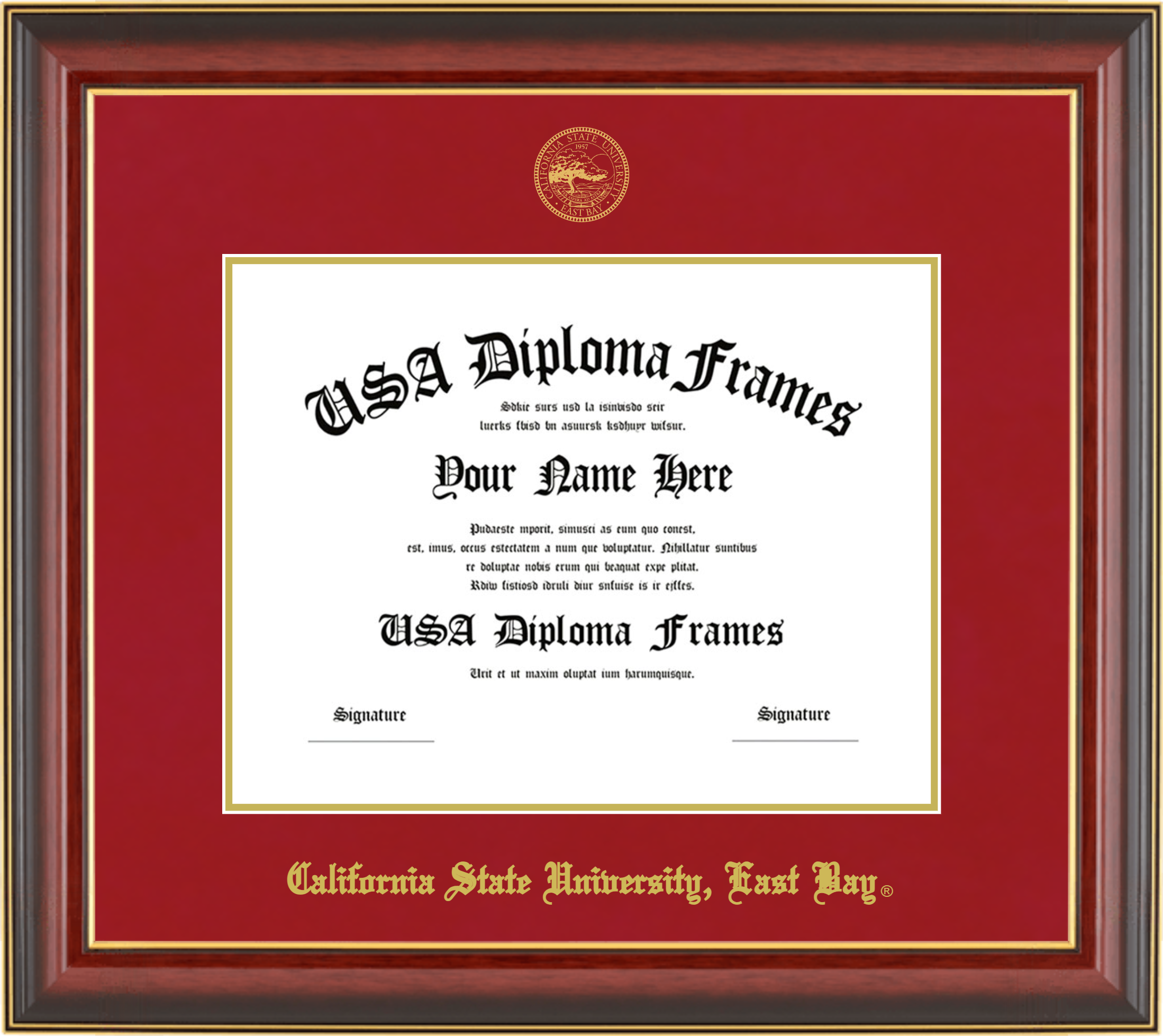 California State University, East Bay – Single Horizontal Document ( Diploma ) – Cherry Mahogany Gold Trim Glossy – Crimson Mat – Gold Accent Mat – With Seal(University Seal Gold) – With Gold Embossing (California State University, East Bay)