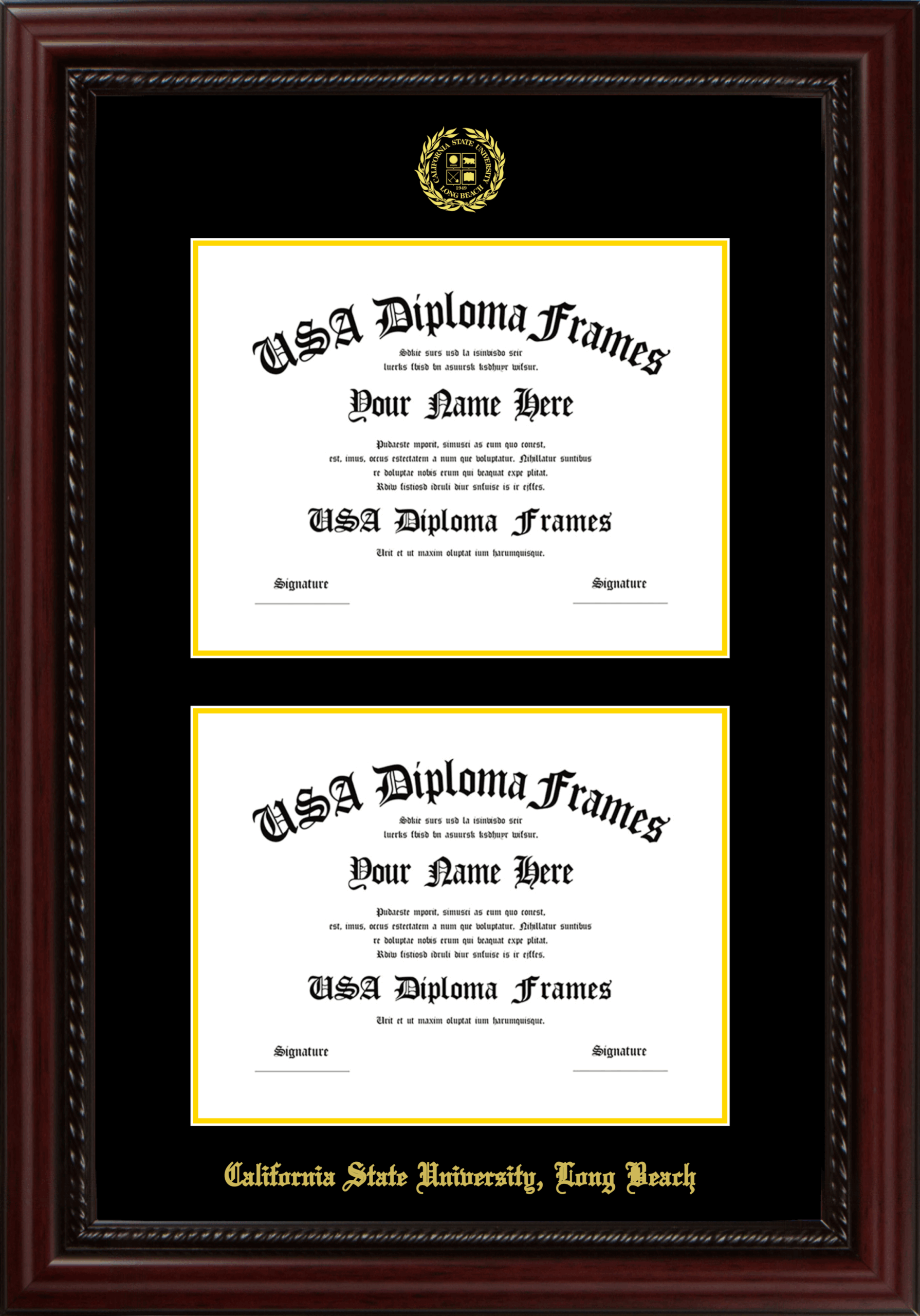 California State University Long Beach Double Diploma Frame – Double Document – Executive Cherry Rope – Black and Yellow Gold Mat