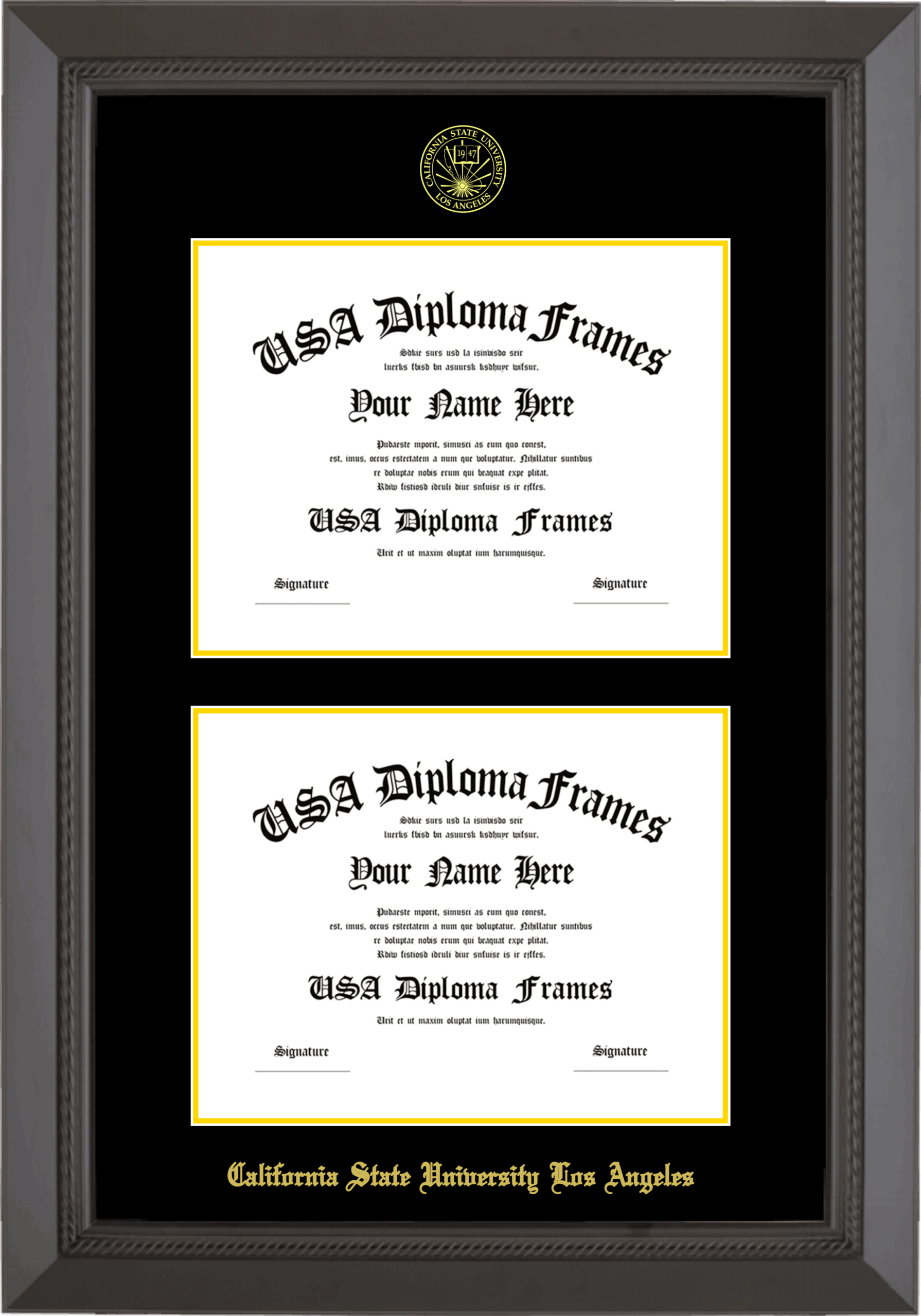 California State University Los Angeles Double Diploma Frame – Double Document – Black Rope – Black and Yellow Gold Mat