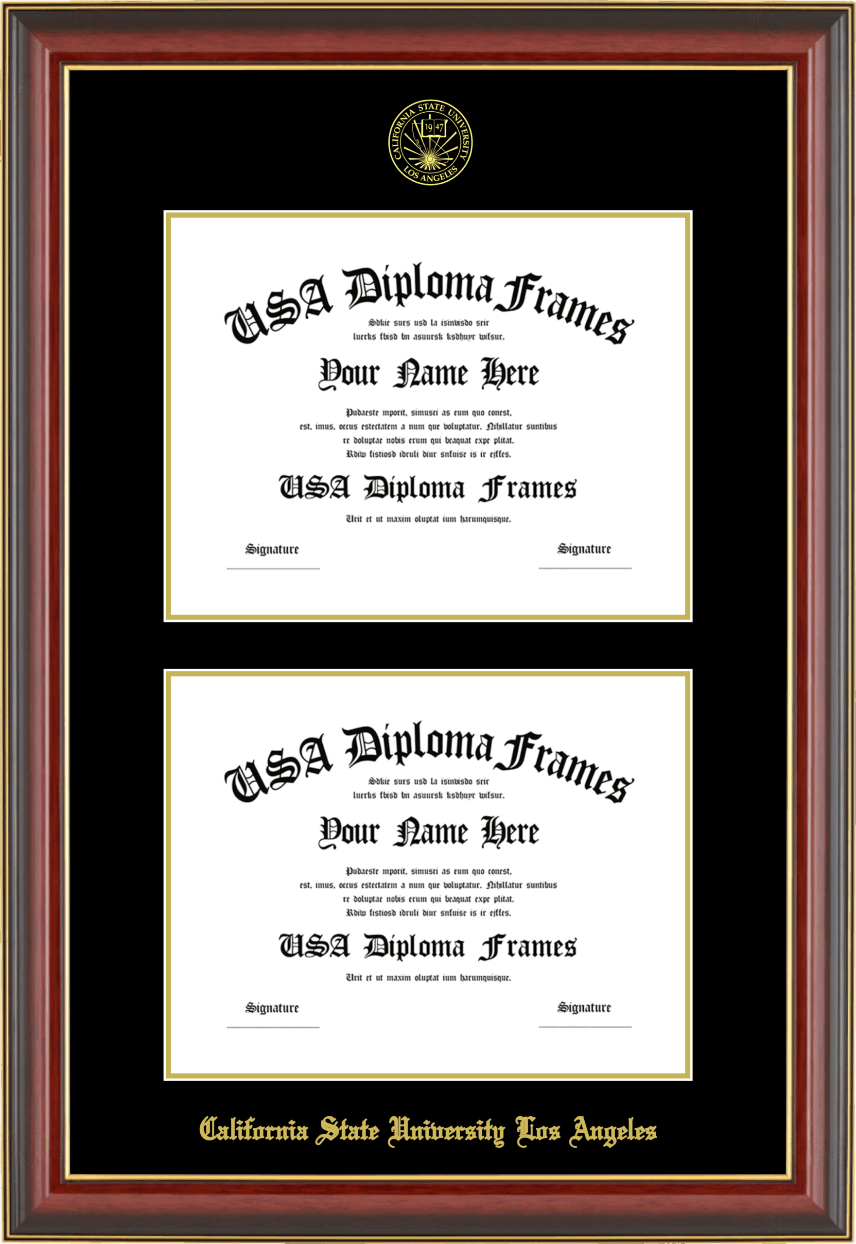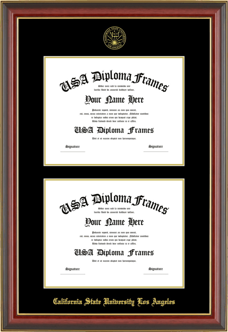 California State University Los Angeles Double Diploma Frame – Double Document – Cherry Mahogany Gold Trim Glossy – Black and Gold Mat