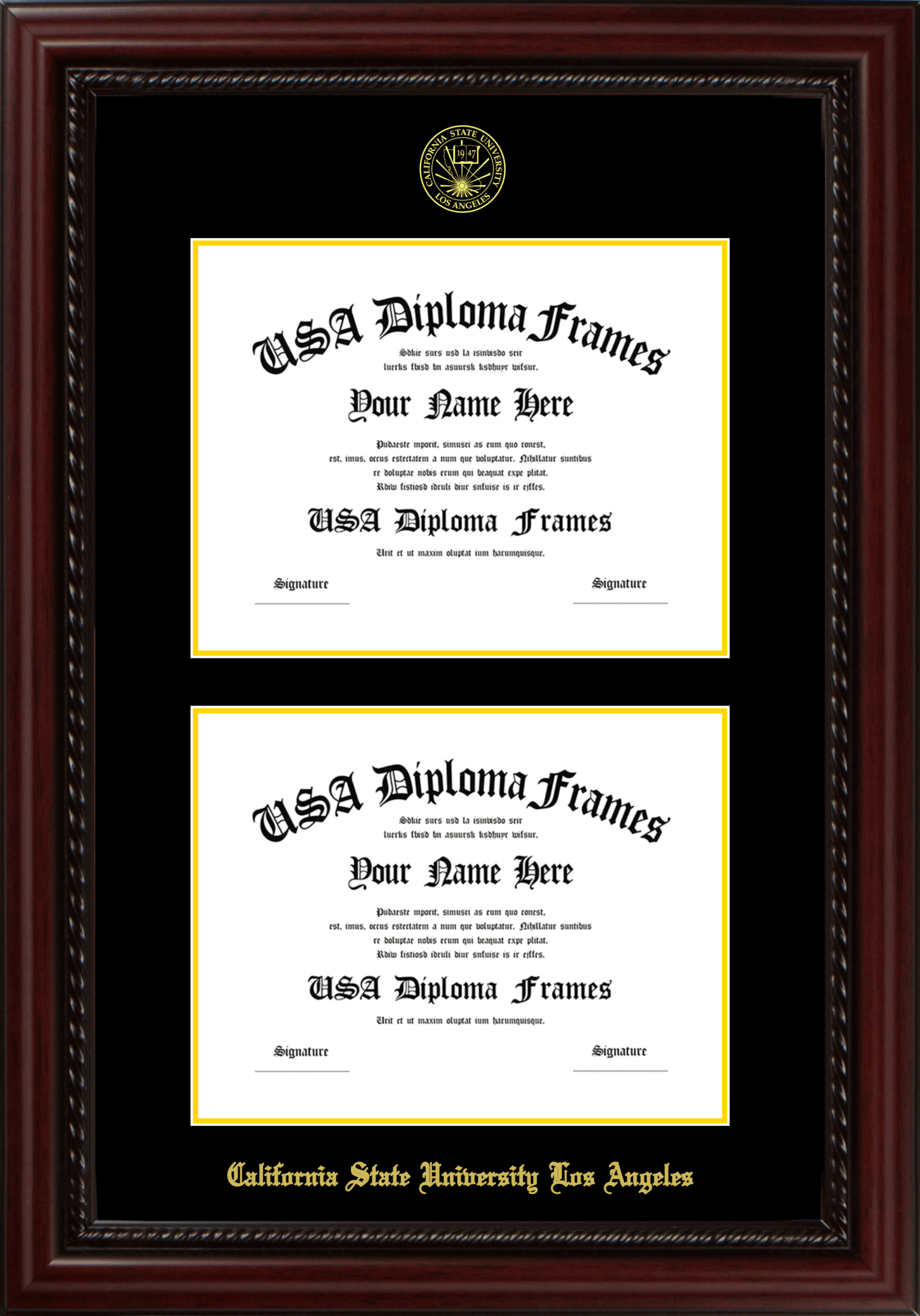 California State University Los Angeles Double Diploma Frame – Double Document – Executive Cherry Rope – Black and Yellow Gold Mat