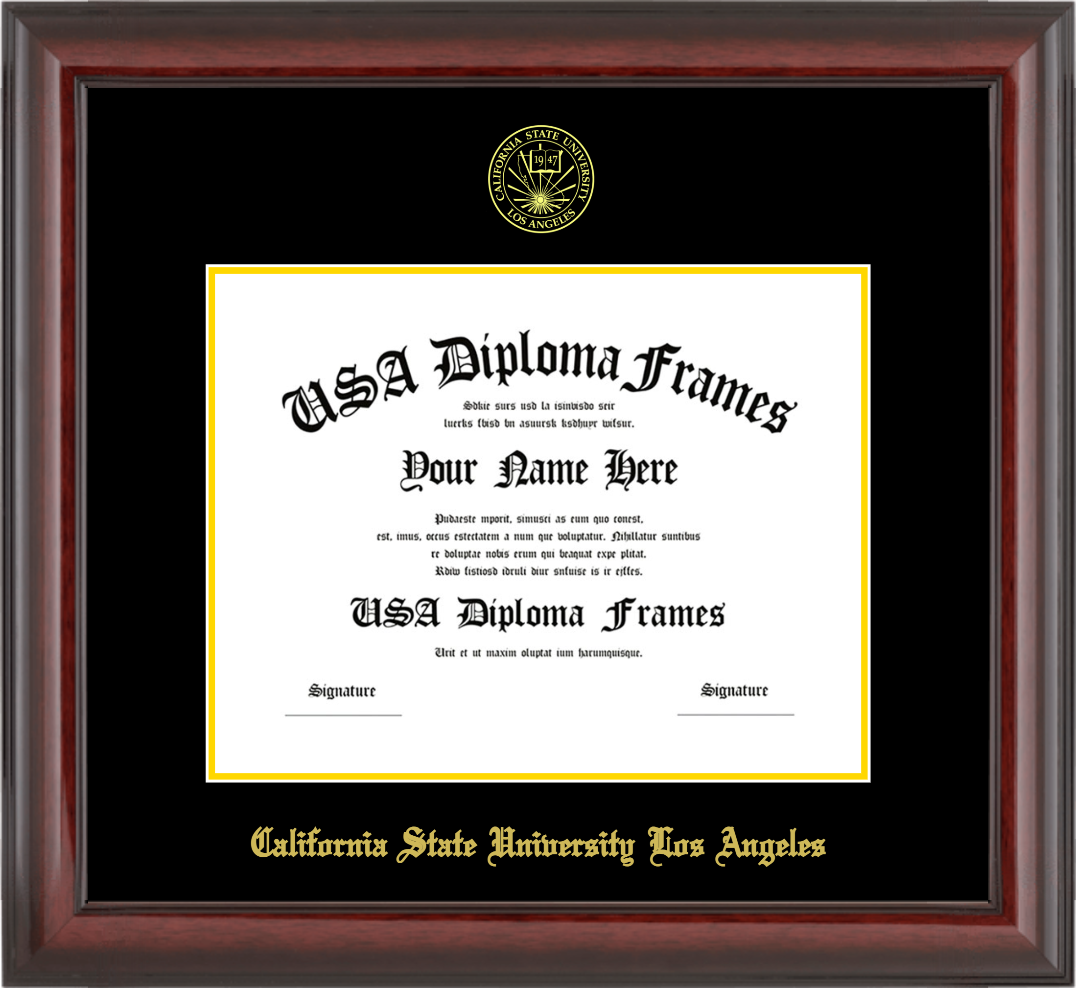 California State University Los Angeles Diploma Frame -Cherry Mahogany Glossy – Black and Yellow Gold Mat