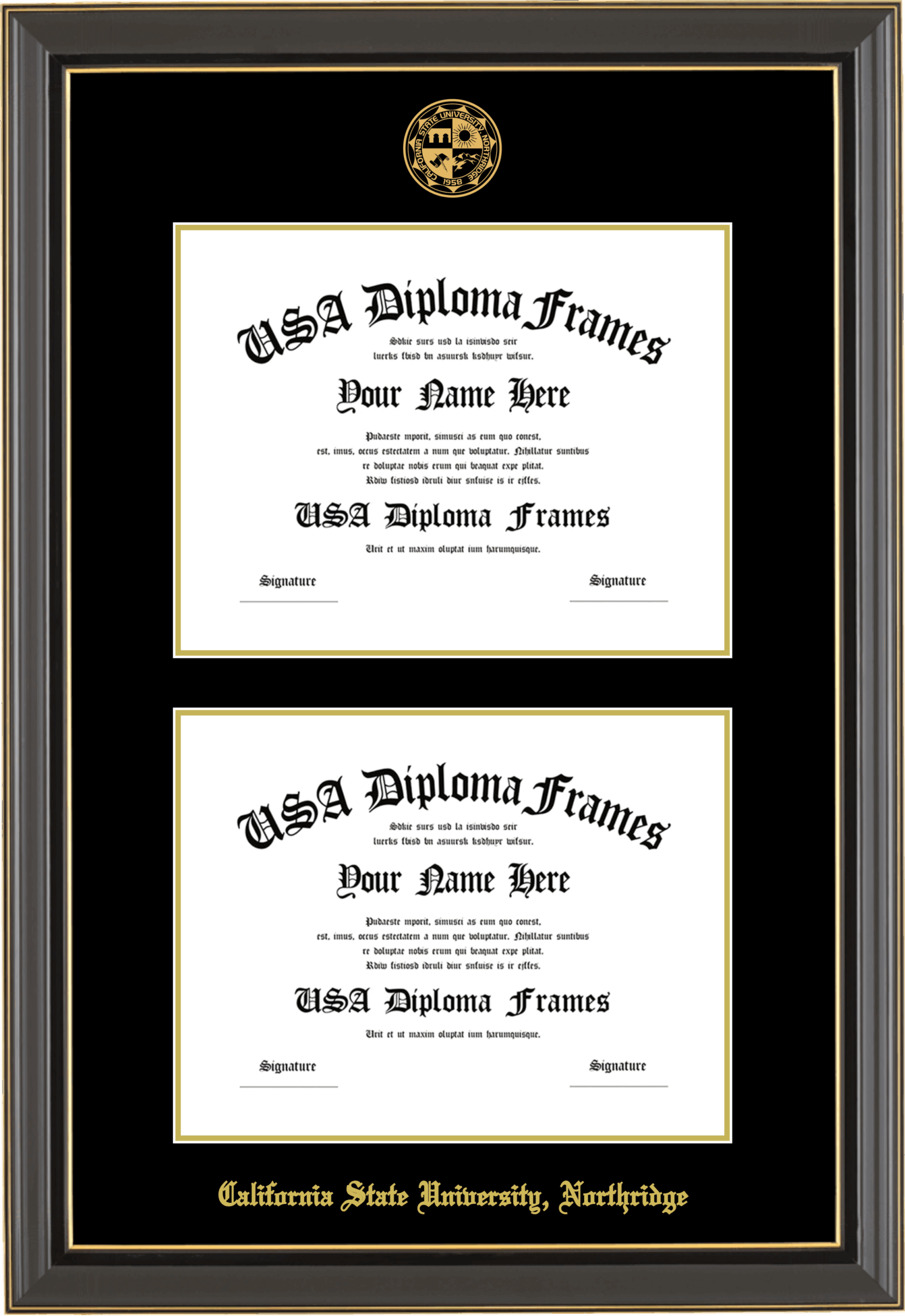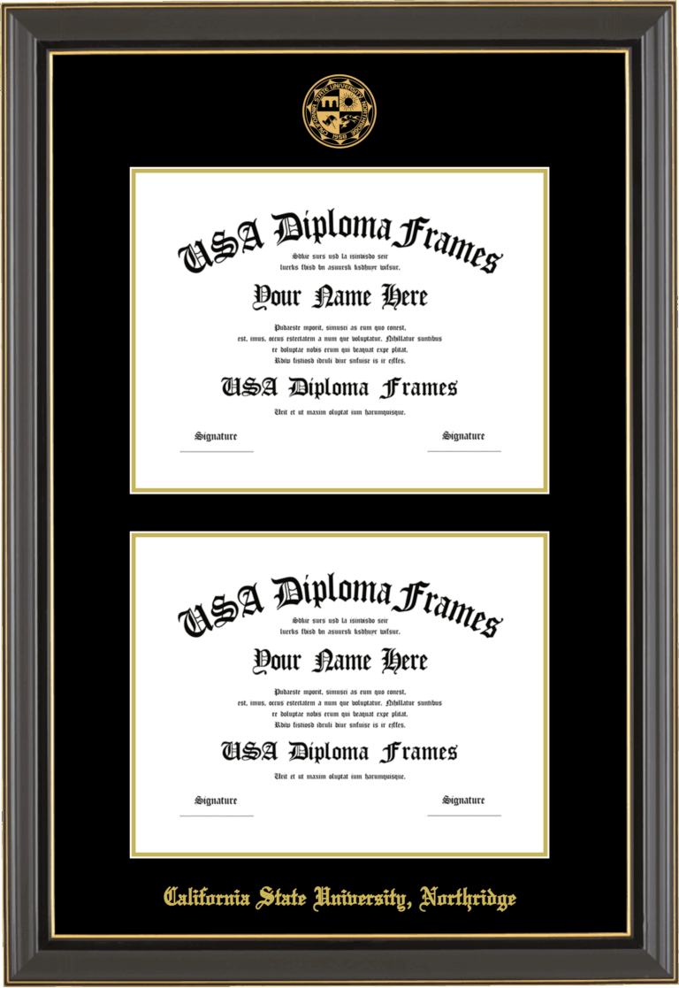 California State University, Northridge Double Diploma Frame – Double Document – Black Gold Trim Glossy – Black and Gold Mat