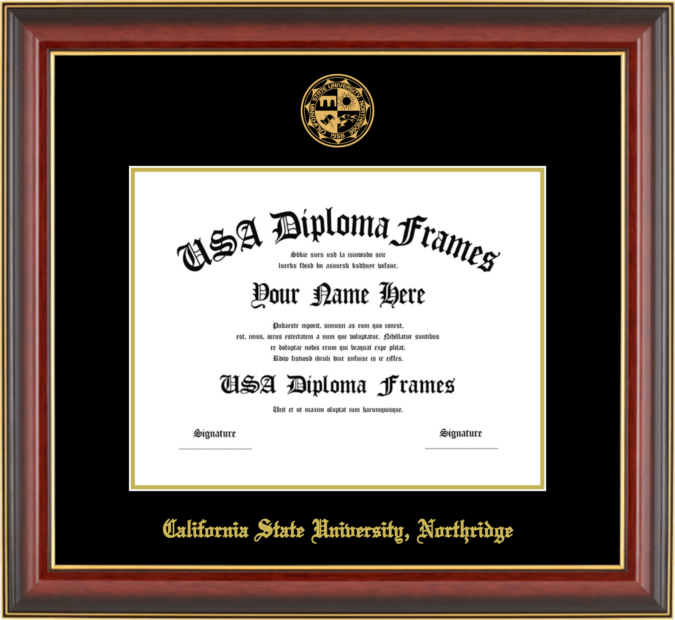 California State University, Northridge Diploma Frame – Cherry Mahogany Gold Trim Glossy – Black and Gold Mat