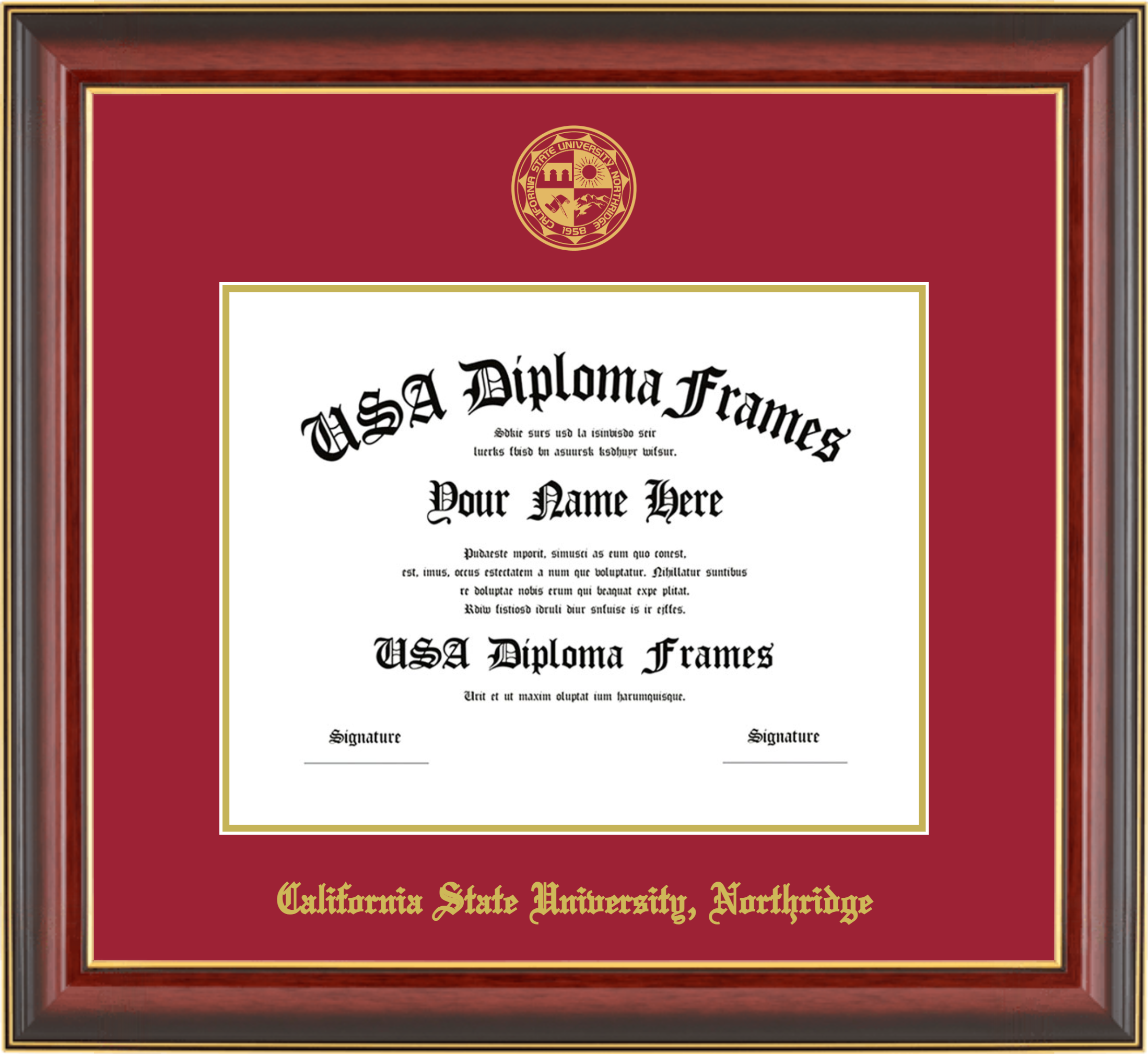 California State University, Northridge Diploma Frame – Cherry Mahogany Gold Trim Glossy – Crimson and Gold Mat