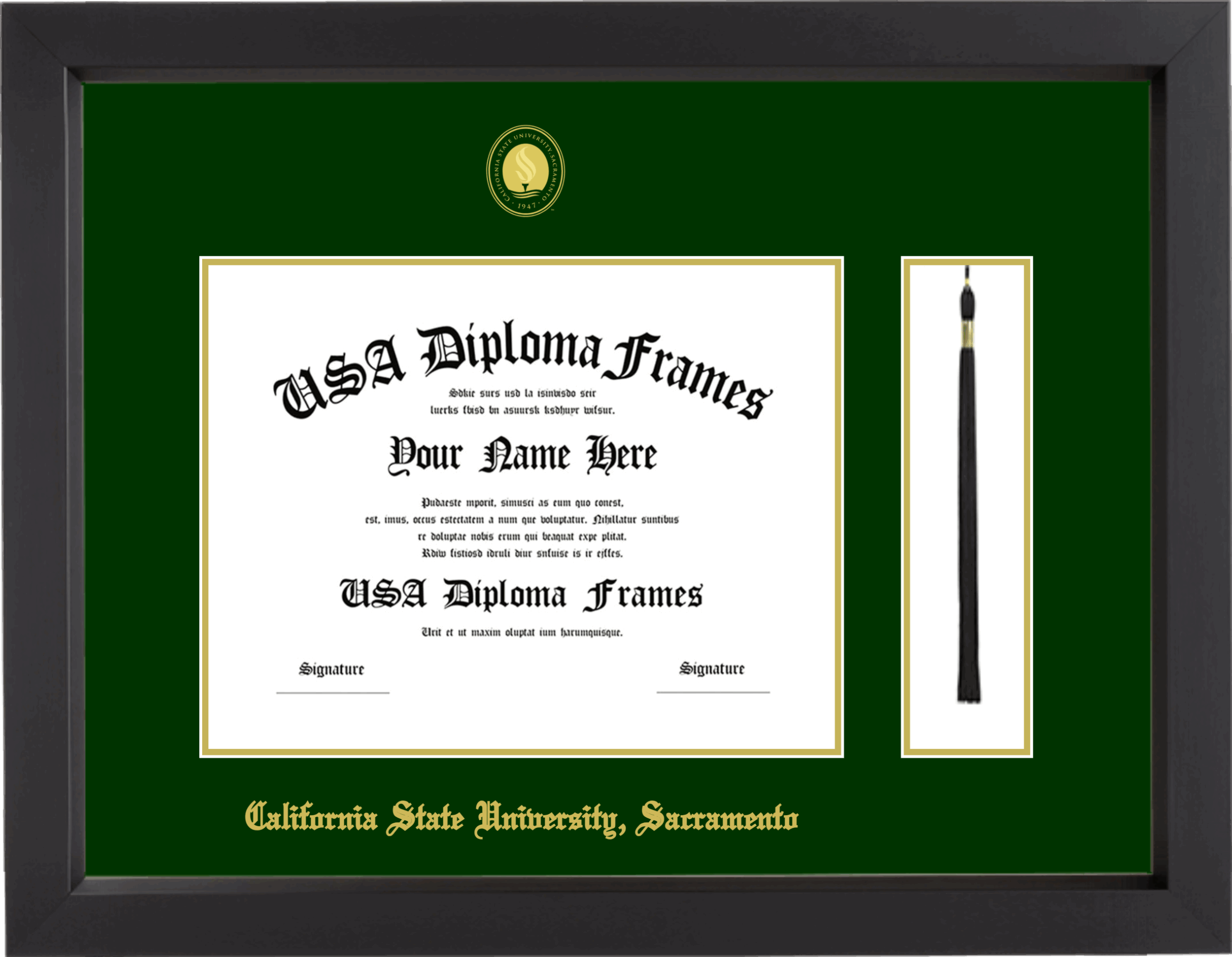 California State University, Sacramento Diploma Frame with Tassel – Black Matte – Winter Green and Gold Mat