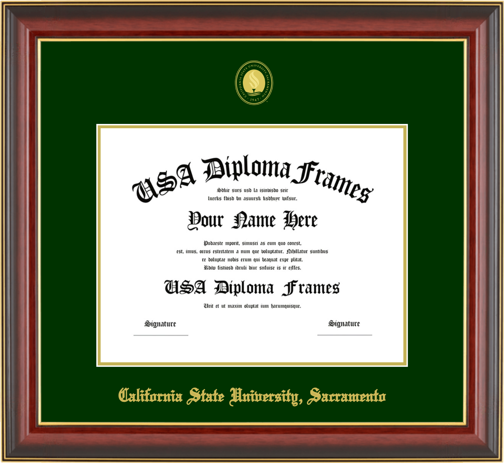 California State University, Sacramento – Single Horizontal Document ( Diploma ) – Cherry Mahogany Gold Trim Glossy – Winter Green Mat – Gold Accent Mat – With Seal(University Seal Gold) – With Gold Embossing (California State University, Sacramento)