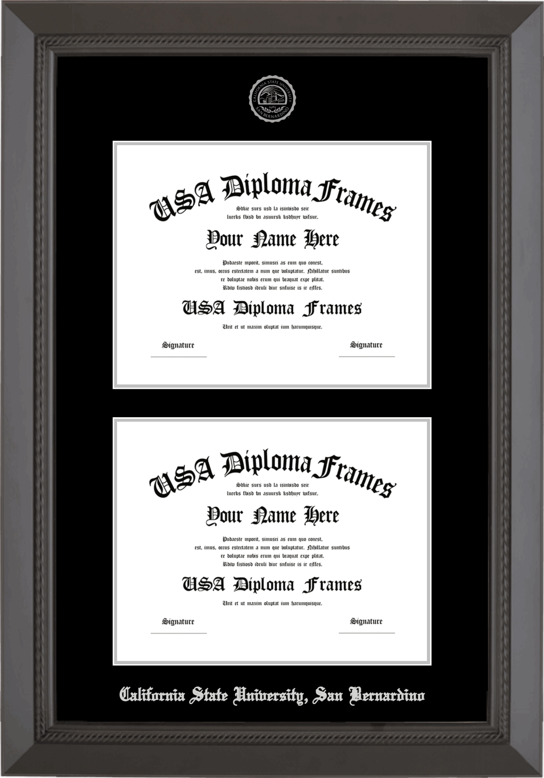 California State University, San Bernardino Double Diploma Frame – Double Document – Black Rope – Black and Silver Mat