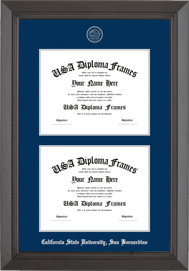 California State University, San Bernardino Double Diploma Frame – Double Document – Black Rope – Navy and Silver Mat