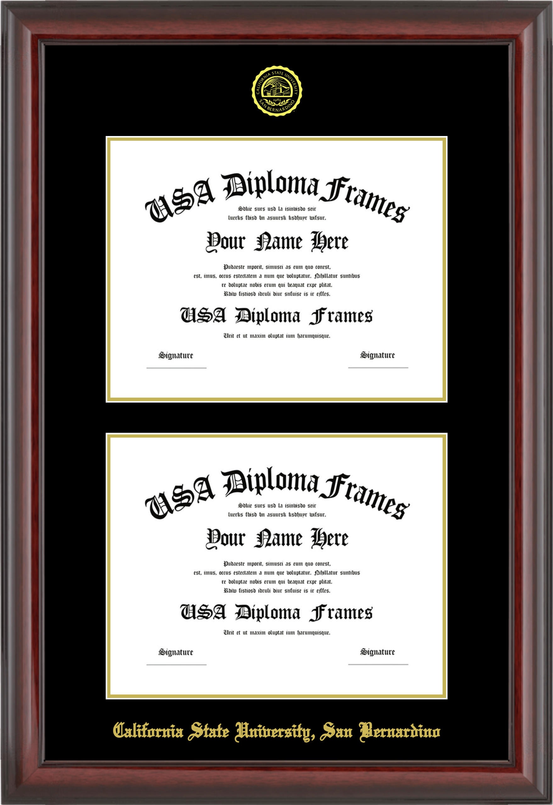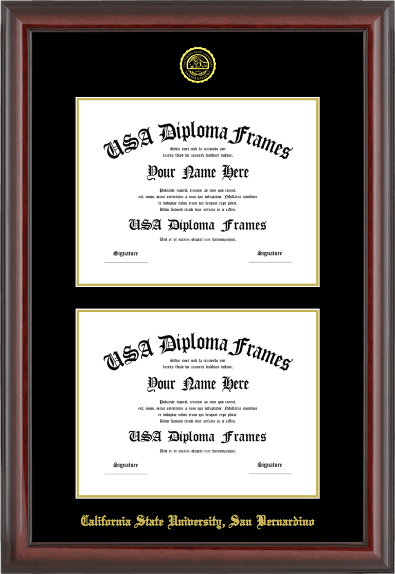 California State University, San Bernardino Double Diploma Frame – Double Document – Cherry Mahogany Glossy – Black and Gold Mat