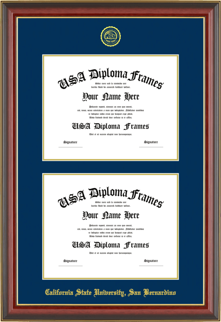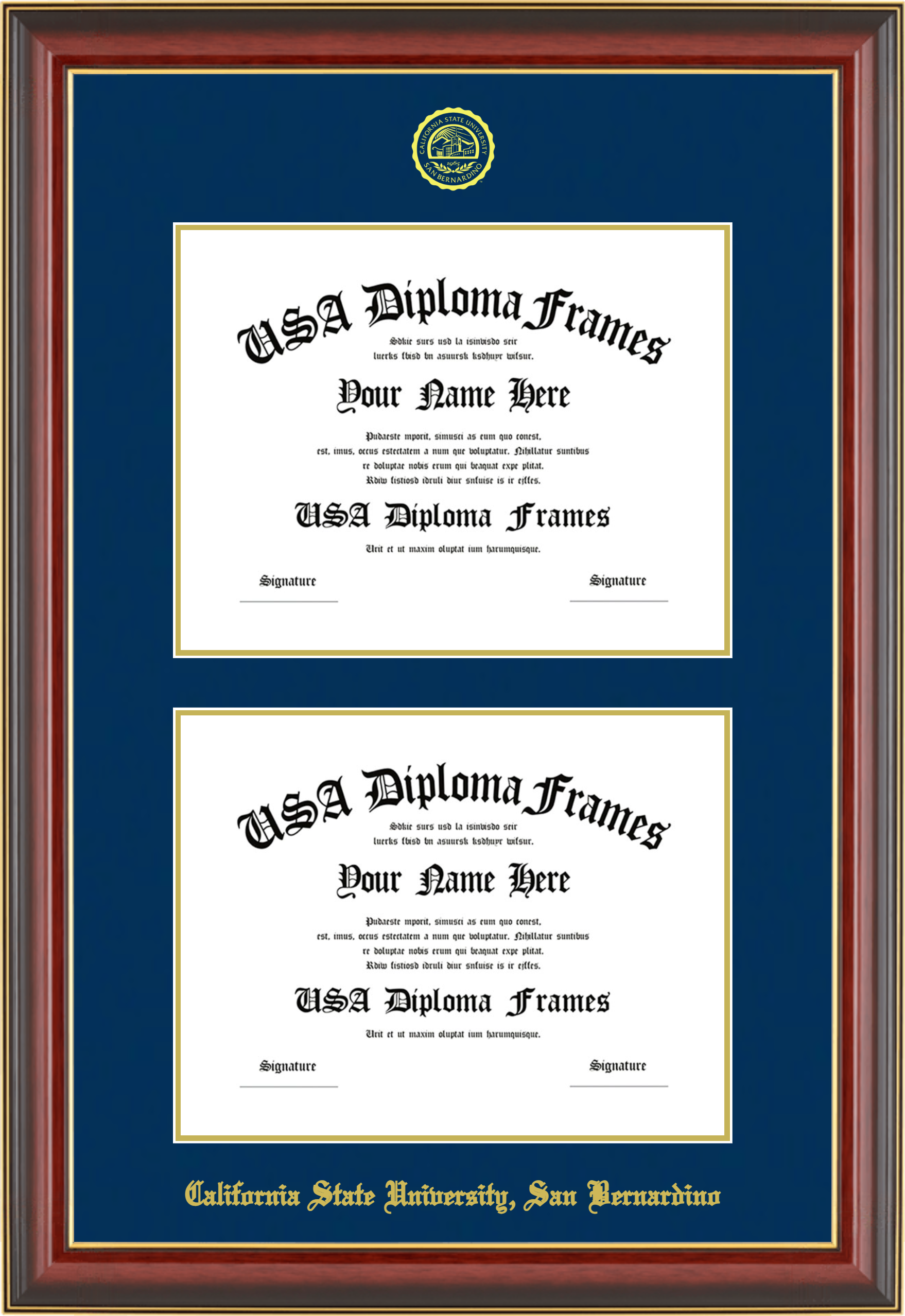 California State University, San Bernardino Double Diploma Frame – Double Document – Cherry Mahogany Gold Trim Glossy – Navy and Gold Mat