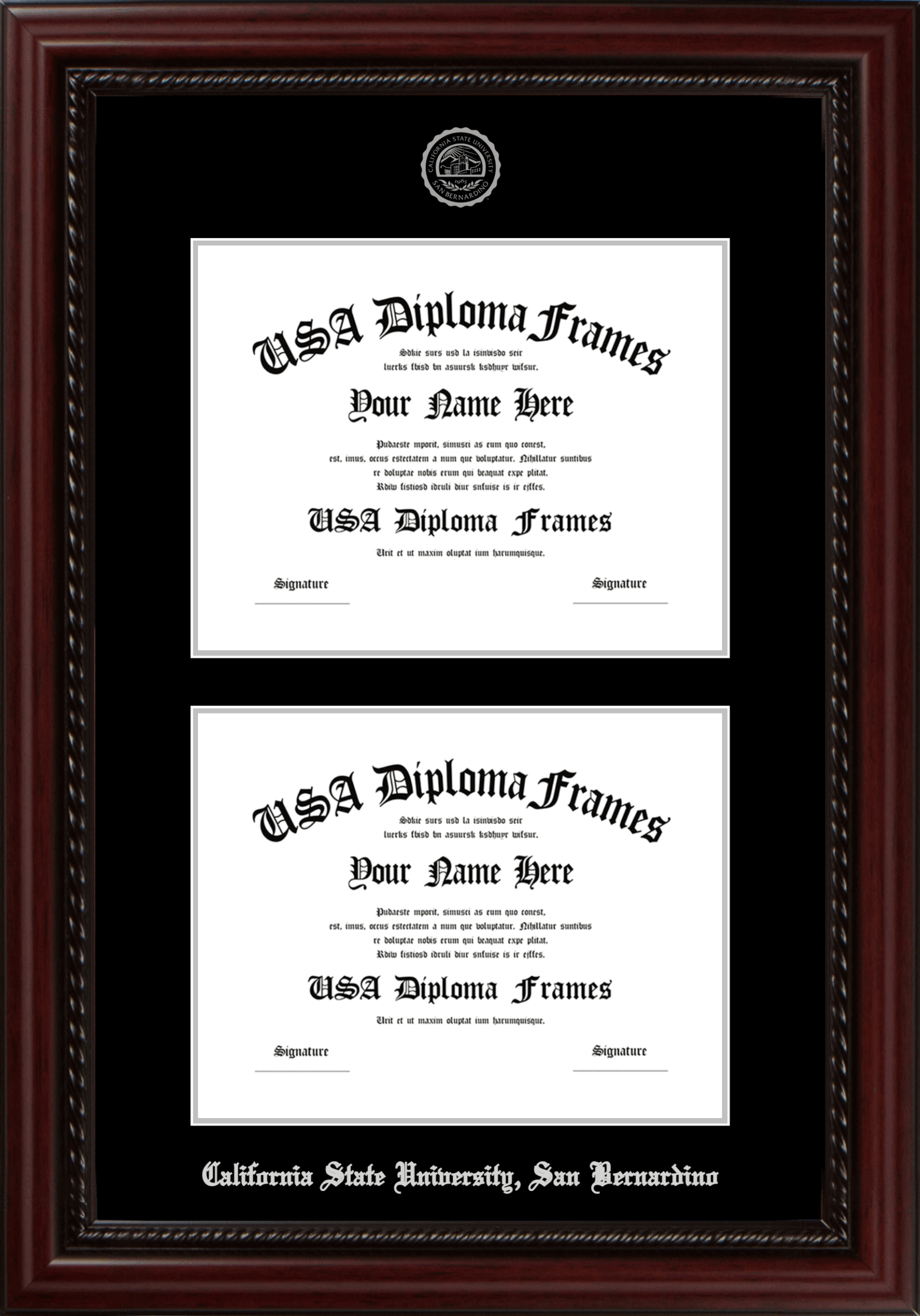 California State University, San Bernardino Double Diploma Frame – Double Document – Executive Cherry Rope – Black and Silver Mat