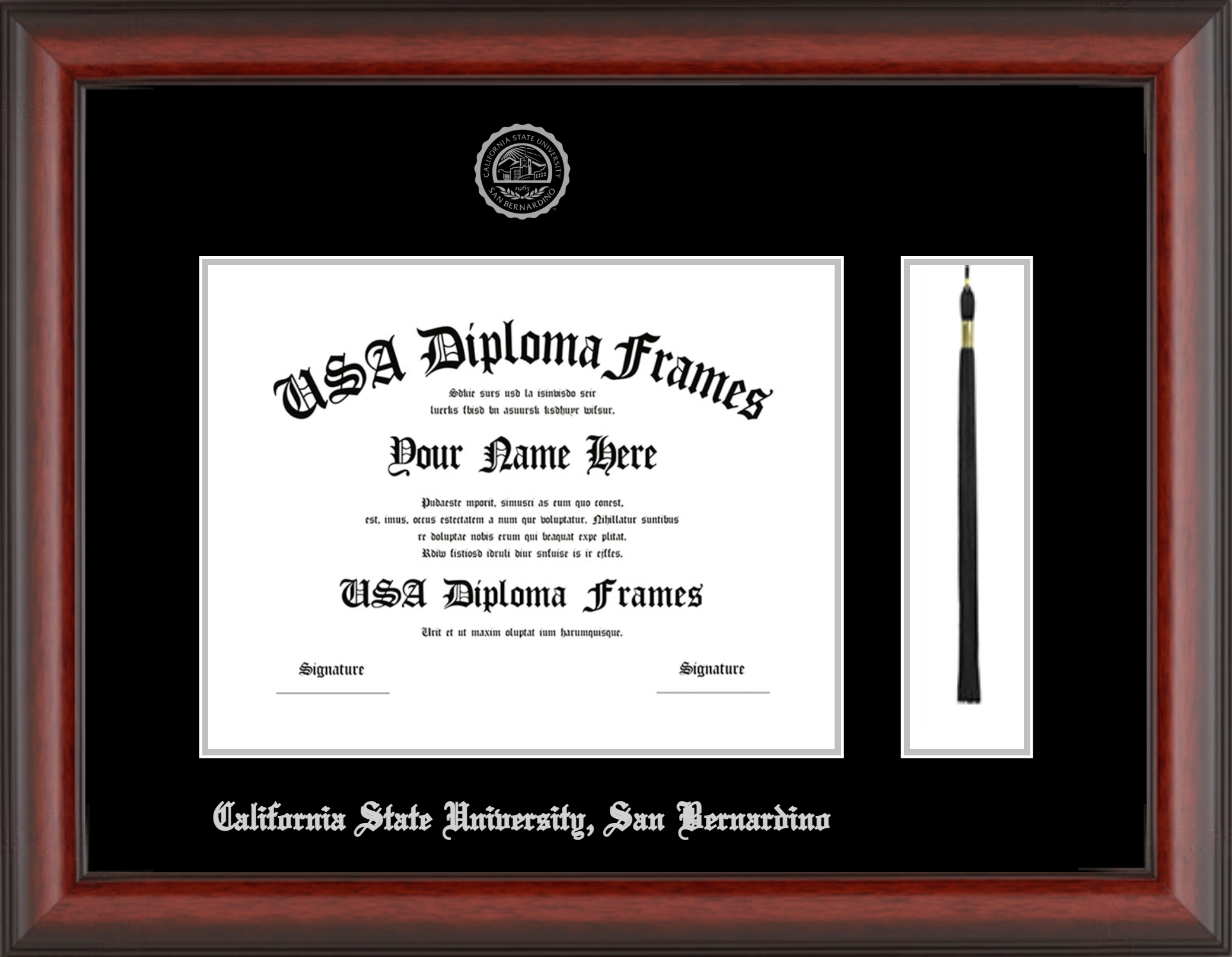California State University, San Bernardino Diploma Frame with Tassel – Cherry Mahogany Matte – Black and- Silver Mat