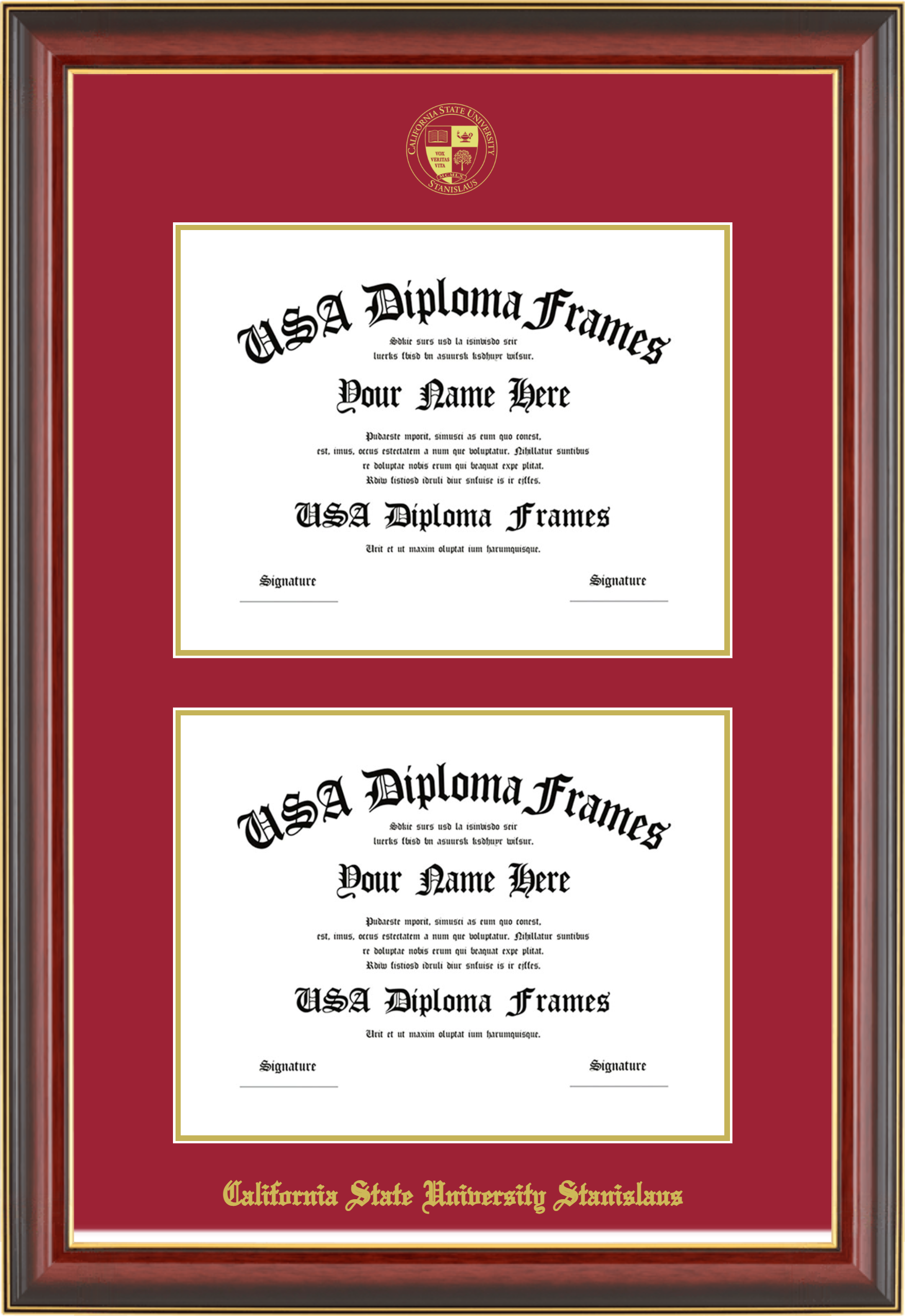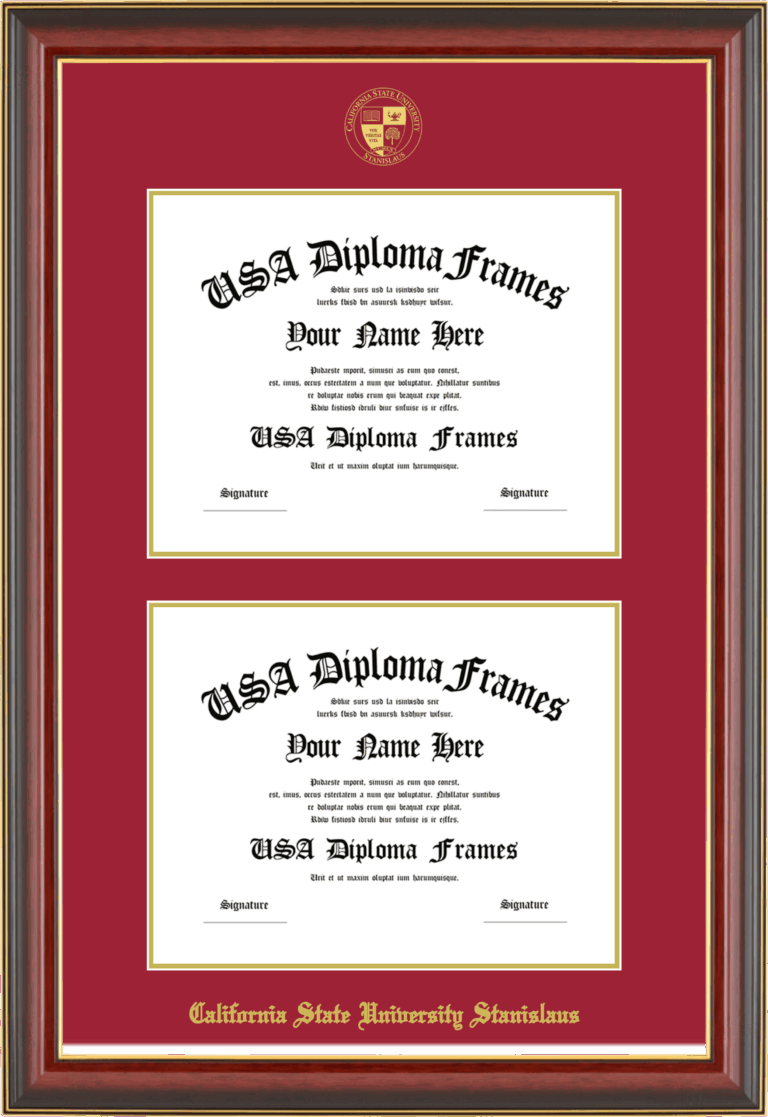 California State University Stanislaus Double Diploma Frame – Double Document – Cherry Mahogany Gold Trim Glossy – Crimson and Gold Mat