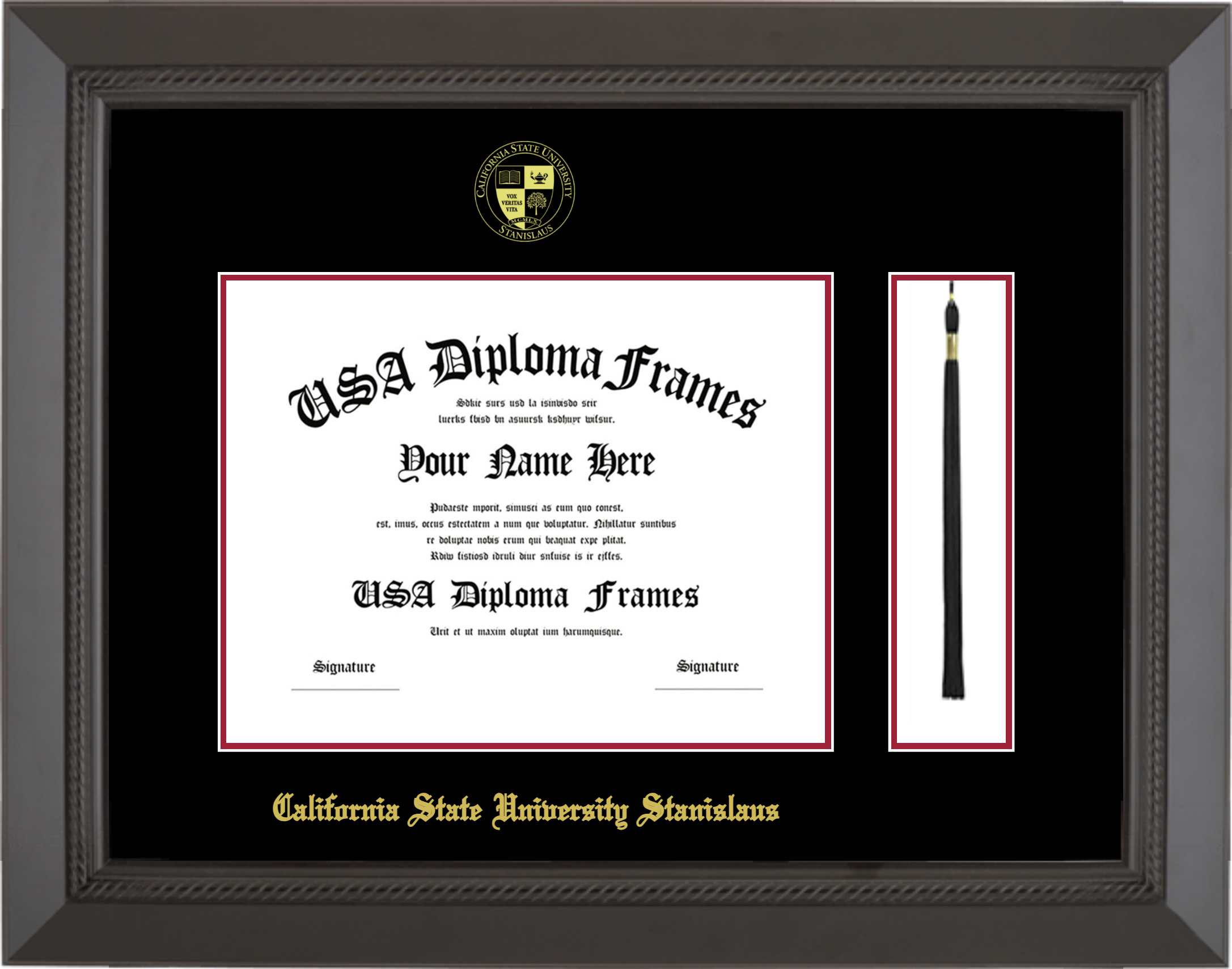 California State University Stanislaus Diploma Frame with Tassel – Black Rope – Black and Crimson Mat