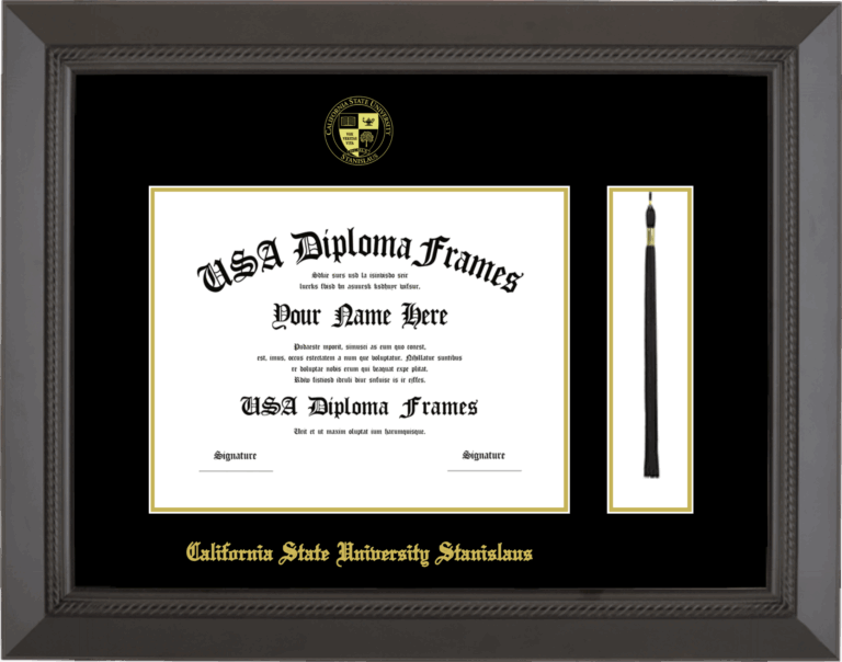 California State University Stanislaus Diploma Frame with Tassel – Black Rope – Black and Gold Mat