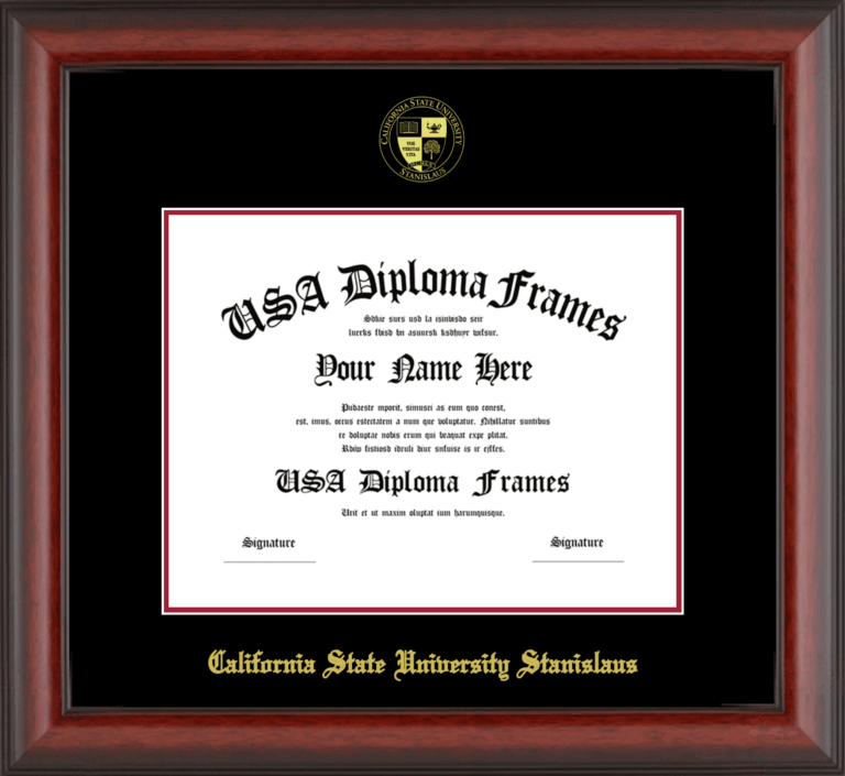 Want to explore more styles? Browse our full range of diploma frame layouts, or visit the California State University Stanislaus to view options available for your school. Looking for a fully personalized design? Try our custom Frame Builder and create a frame that’s uniquely yours.