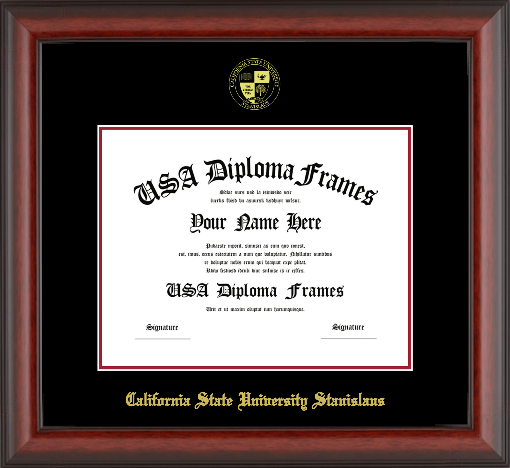 California State University Stanislaus Diploma Frame – Cherry Mahogany Matte – Black and Crimson Mat