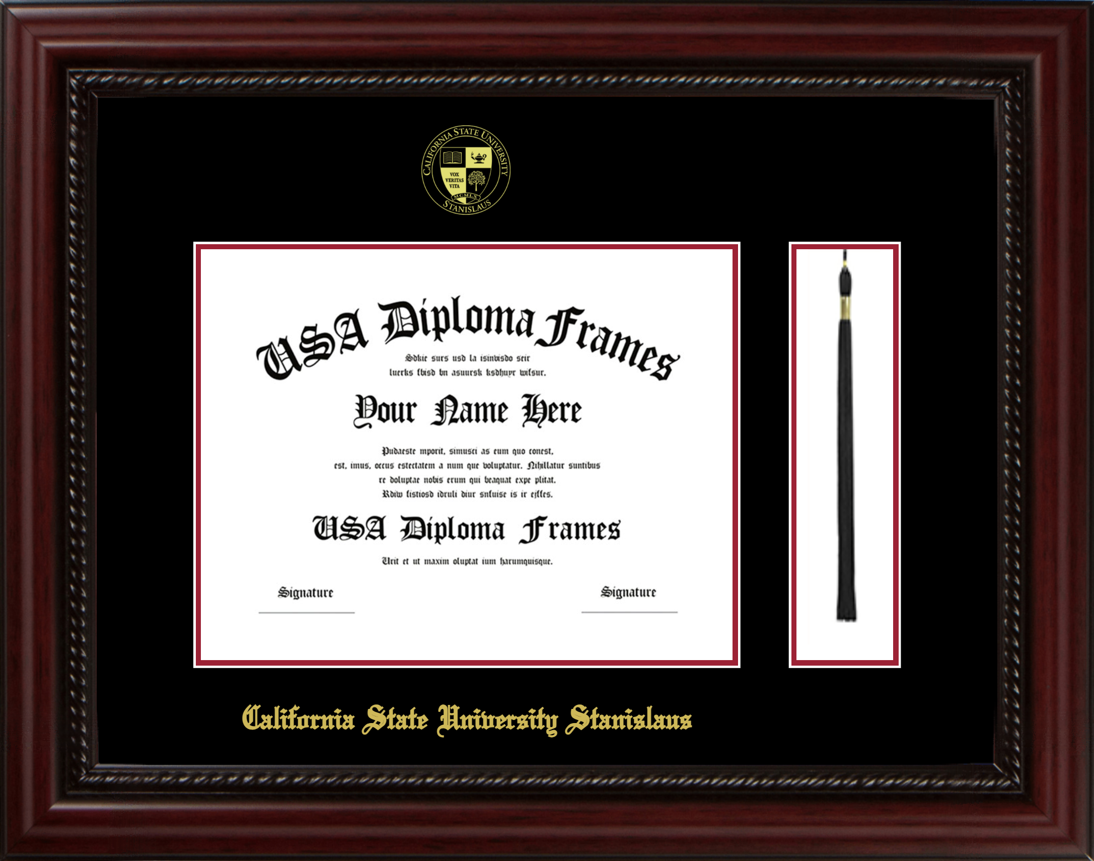 California State University Stanislaus Diploma Frame with Tassel – Executive Cherry Rope – Black and Crimson Mat