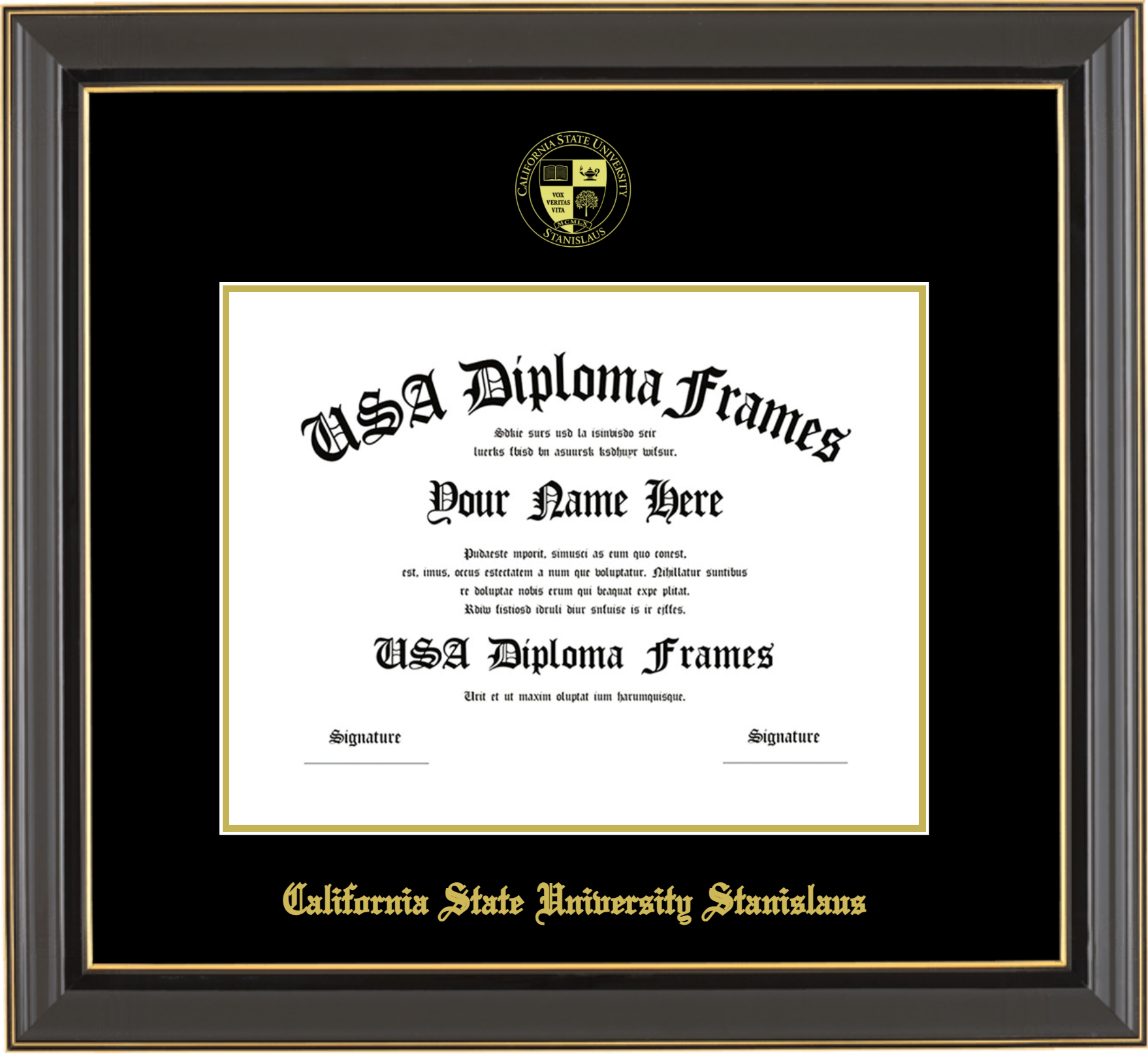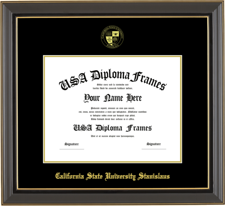 California State University Stanislaus Diploma Frame – Black Gold Trim Glossy – Black and Gold Mat