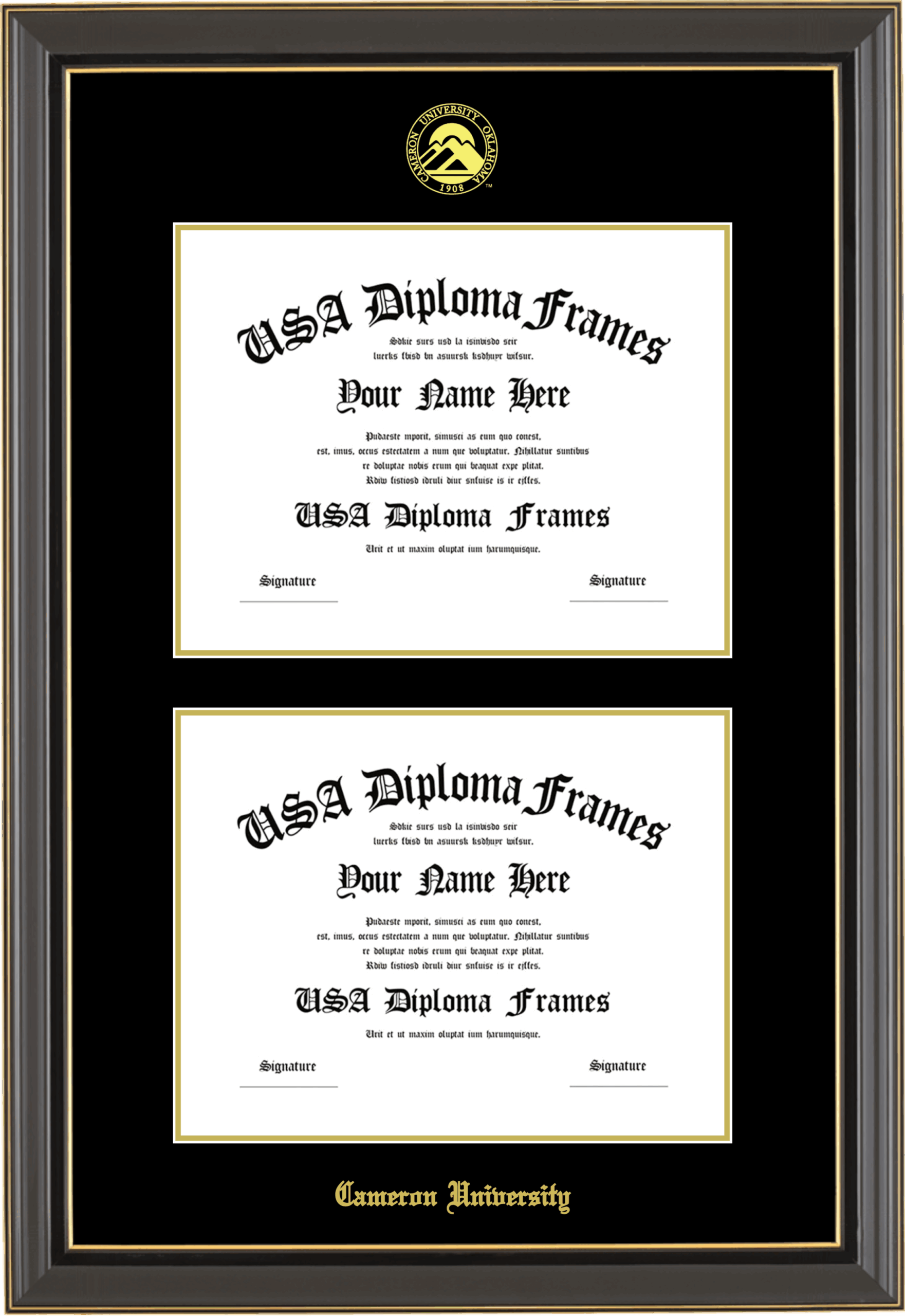 Cameron University Double Diploma Frame – Double Document – Black Gold Trim Glossy – Black and Gold Mat