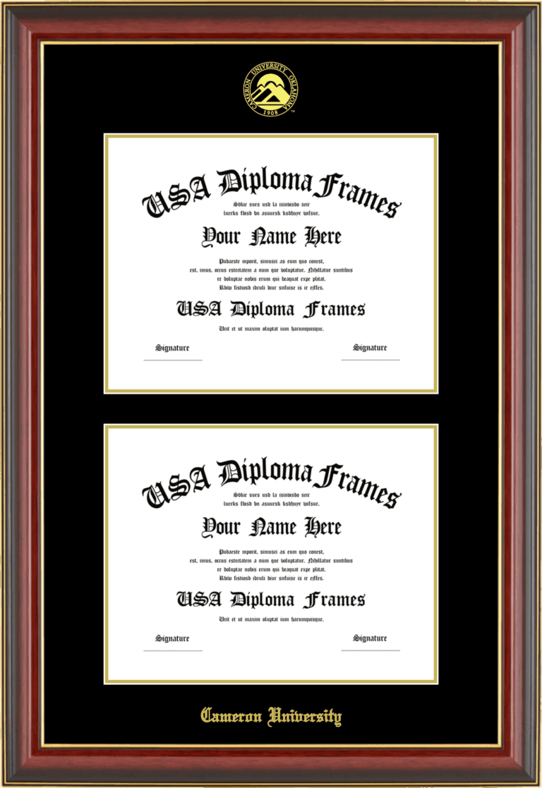 Cameron University Double Diploma Frame – Double Document – Cherry Mahogany Gold Trim Glossy – Black and Gold Mat
