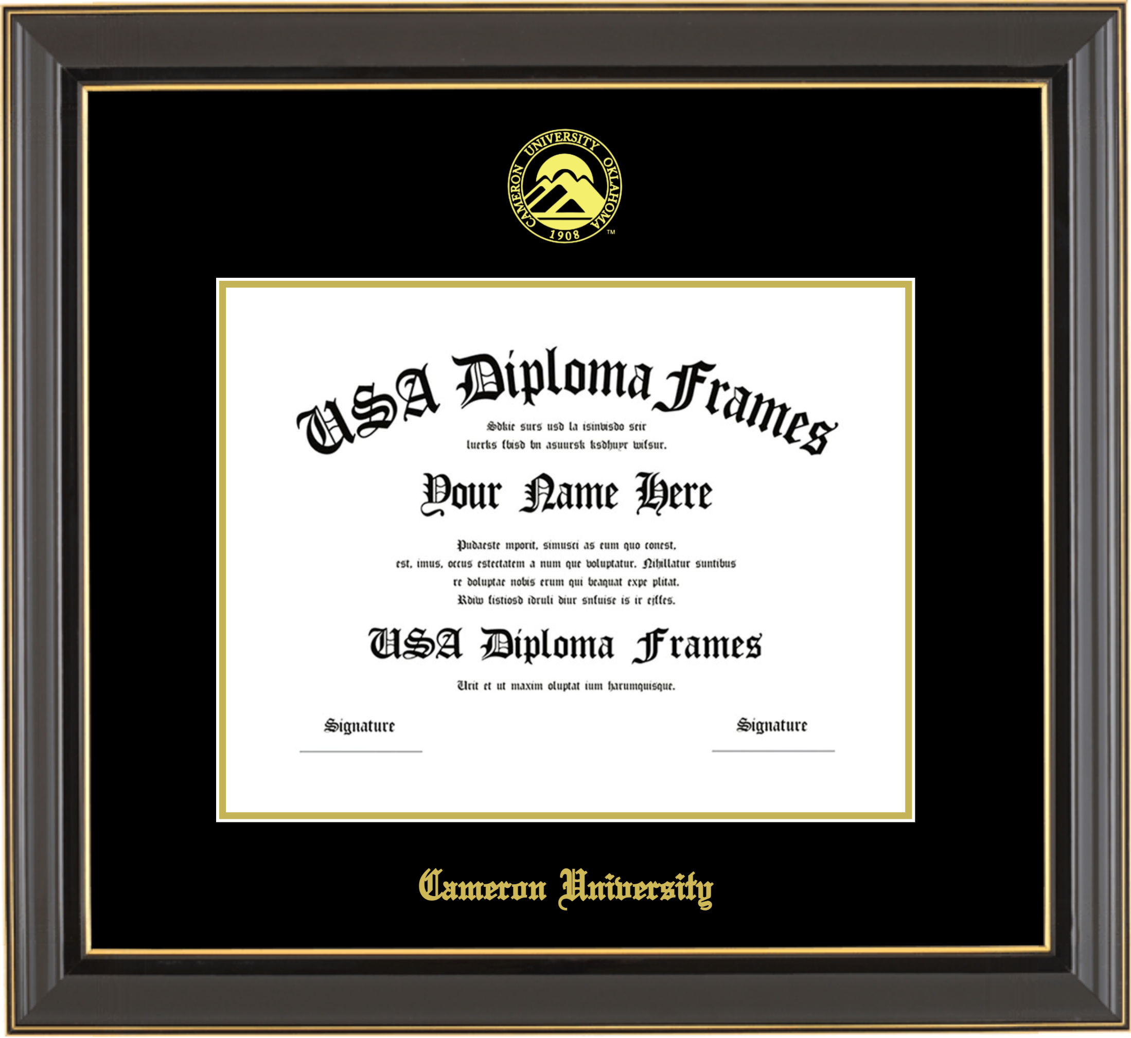 Cameron University Diploma Frame – Black Gold Trim Glossy – Black and Gold Mat