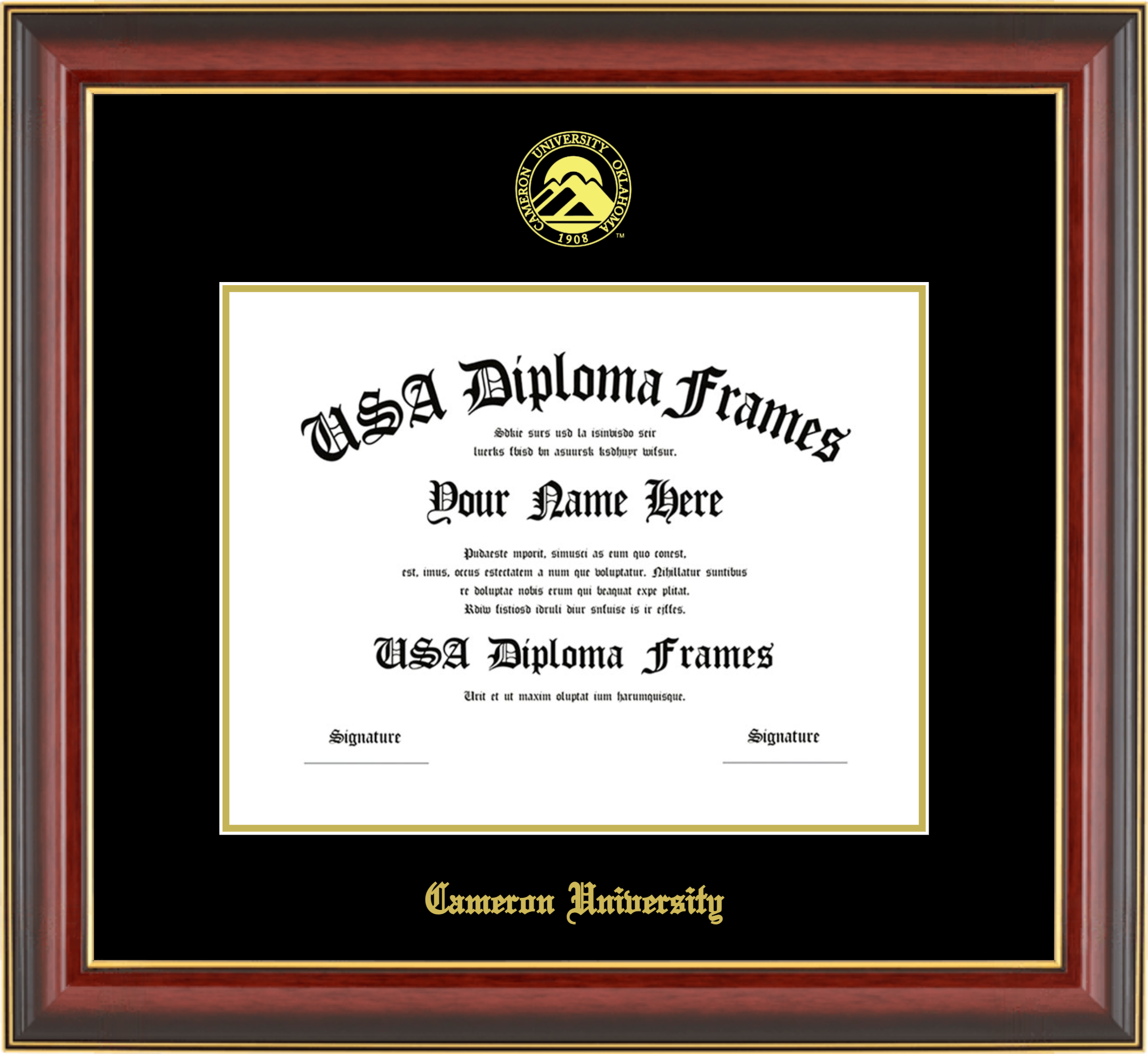 Cameron University Diploma Frame – Cherry Mahogany Gold Trim Glossy – Black and Gold Mat