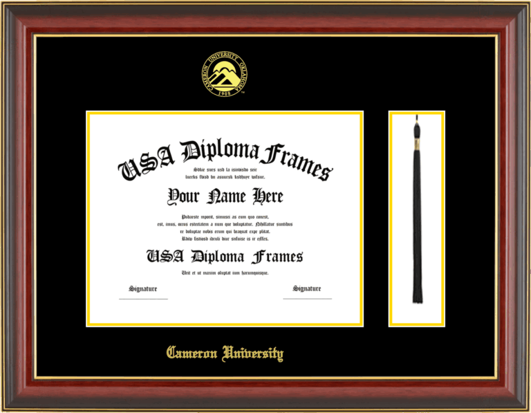 Cameron University Diploma Frame with Tassel – Cherry Mahogany Gold Trim Glossy – Black and Yellow Gold Mat