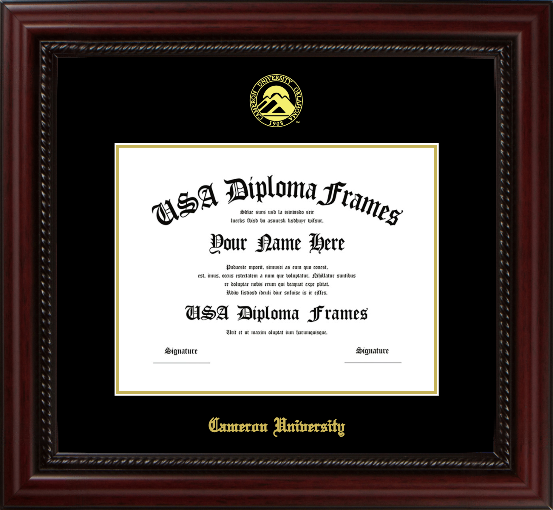Cameron University Diploma Frame – Executive Cherry Rope – Black and Gold Mat